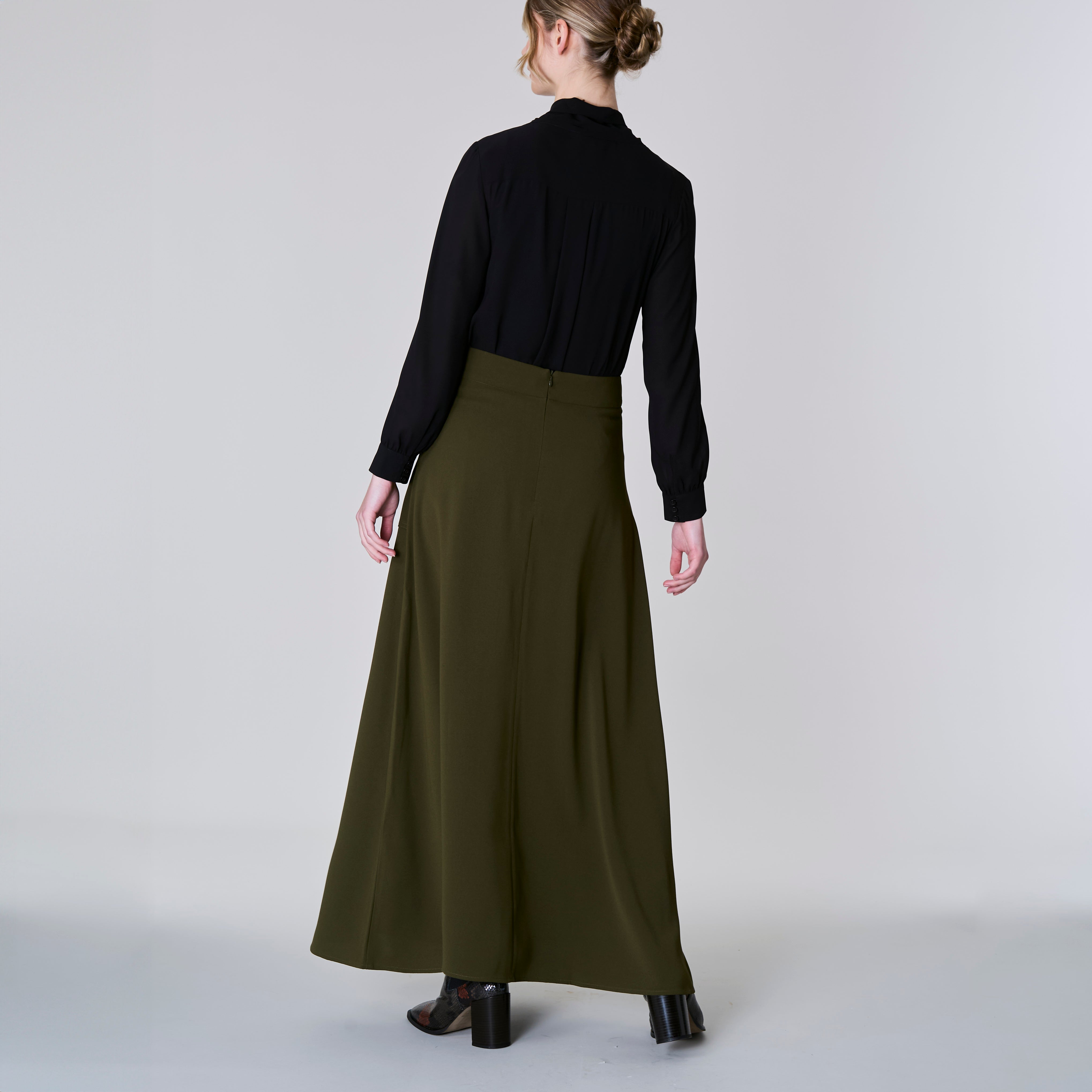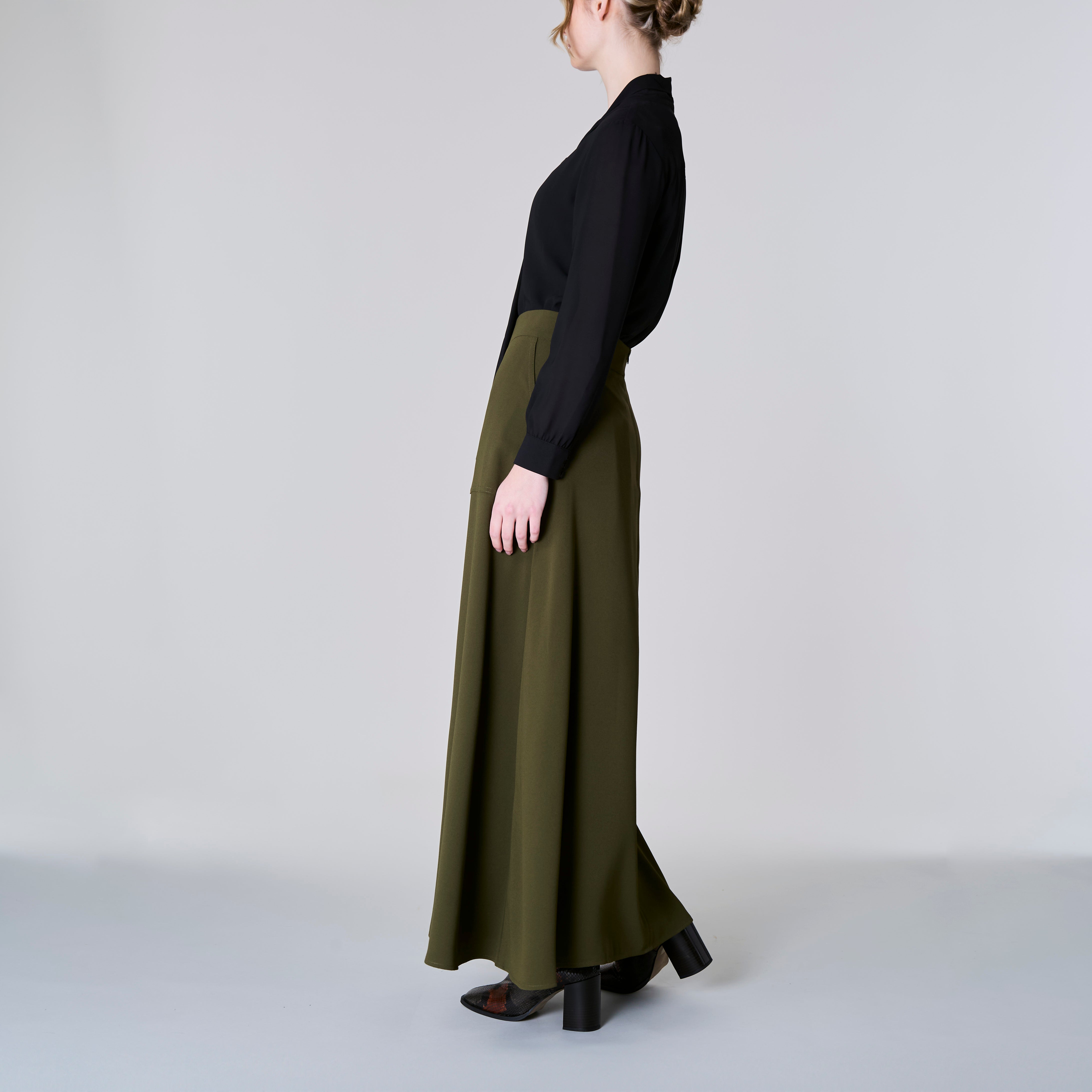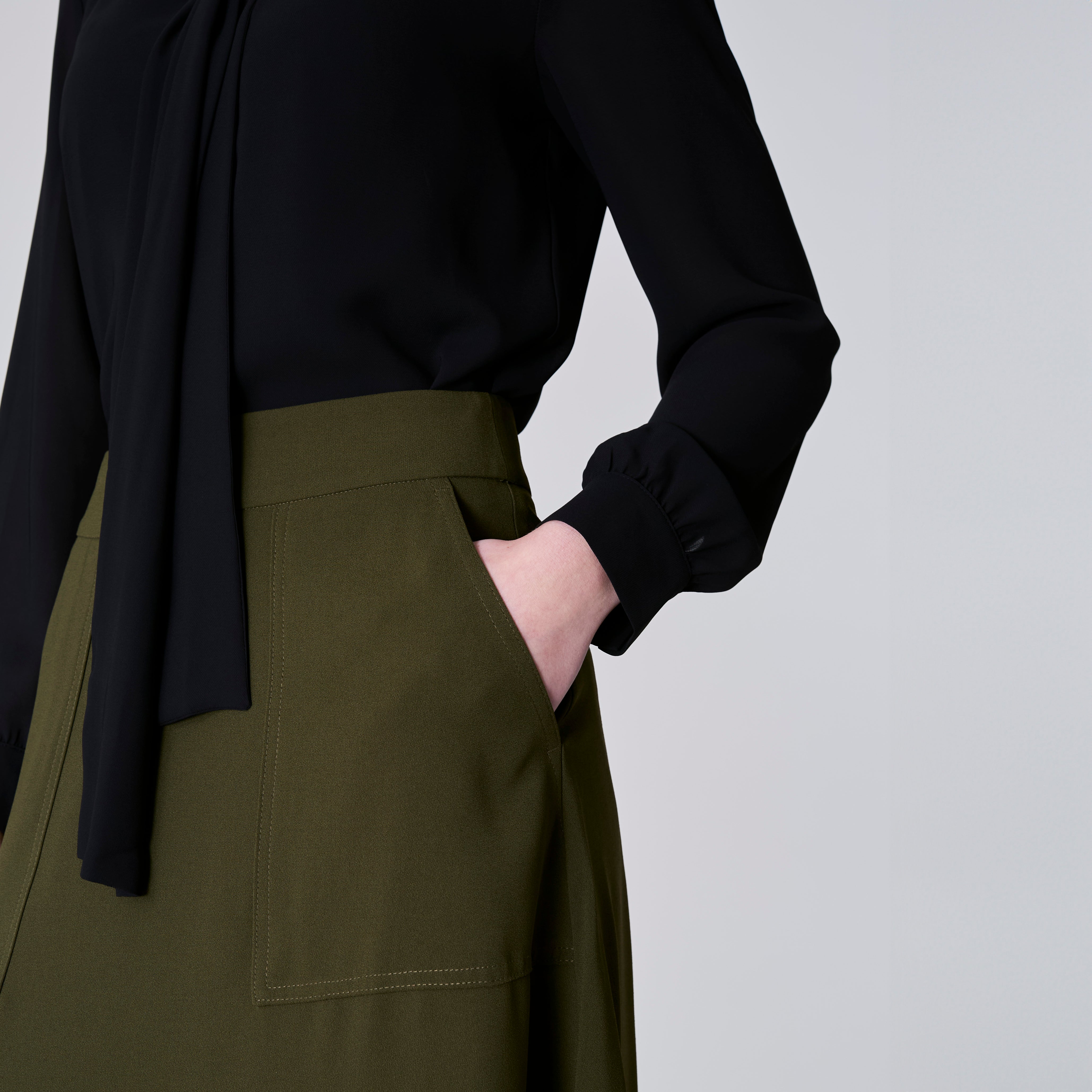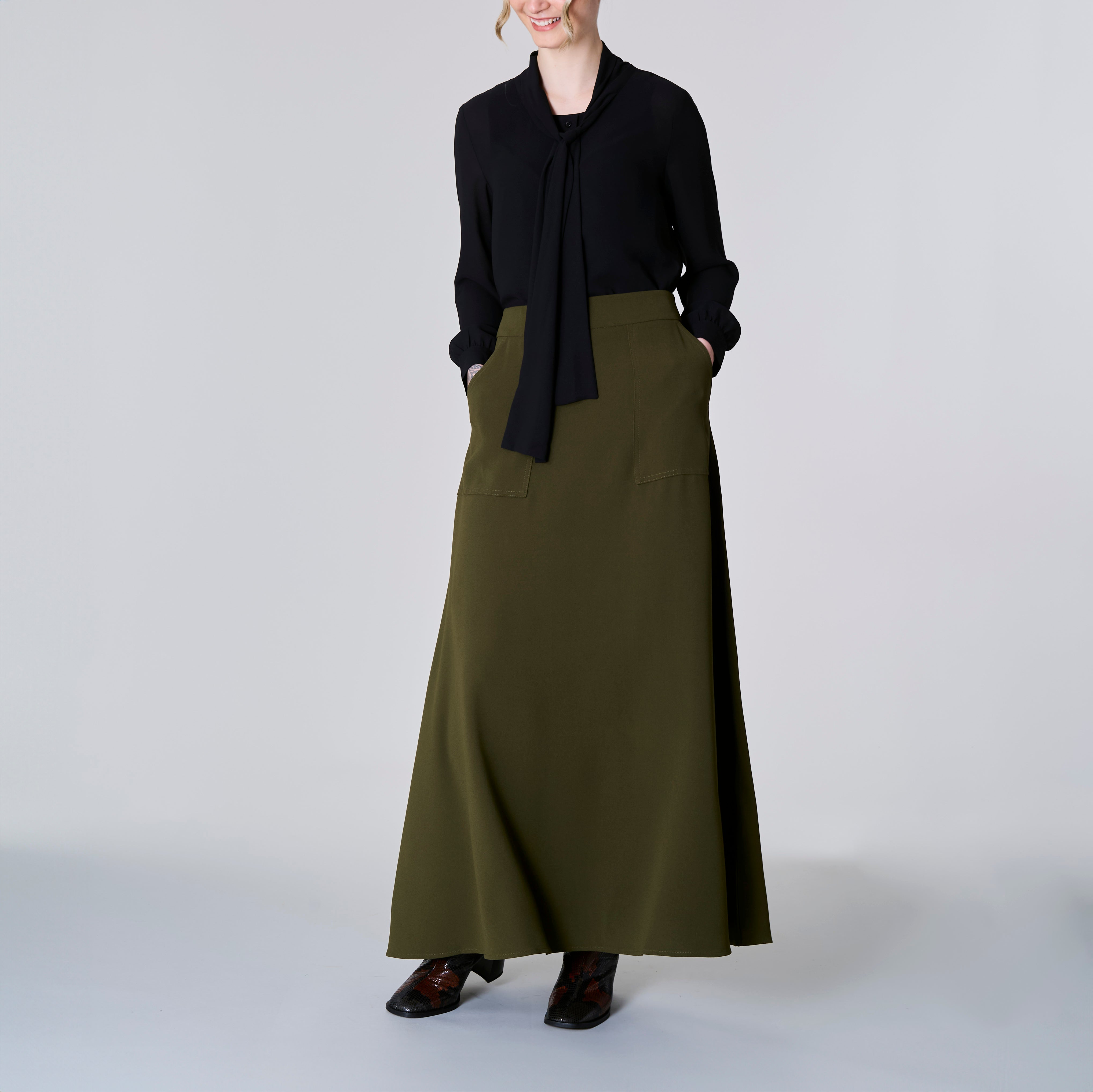 The classic a line skirt in khaki olive, perfect for elevating your workwear wardrobe with contemporary elegance. In a soft hand feel fabric, this stylish skirt's tailored cut imbues a timeless, classic look. Half lined and with large patch stitched pockets.