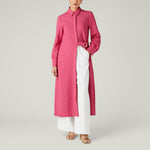 This classic style has been re-created for the season. Effortless and timelessly elegant shirt dress with concealed button placket. Asymmetric Rose Gold D-ring belt. Bonded structured cuff with button closure. Mid-weight solid fabric in electric fuchsia .