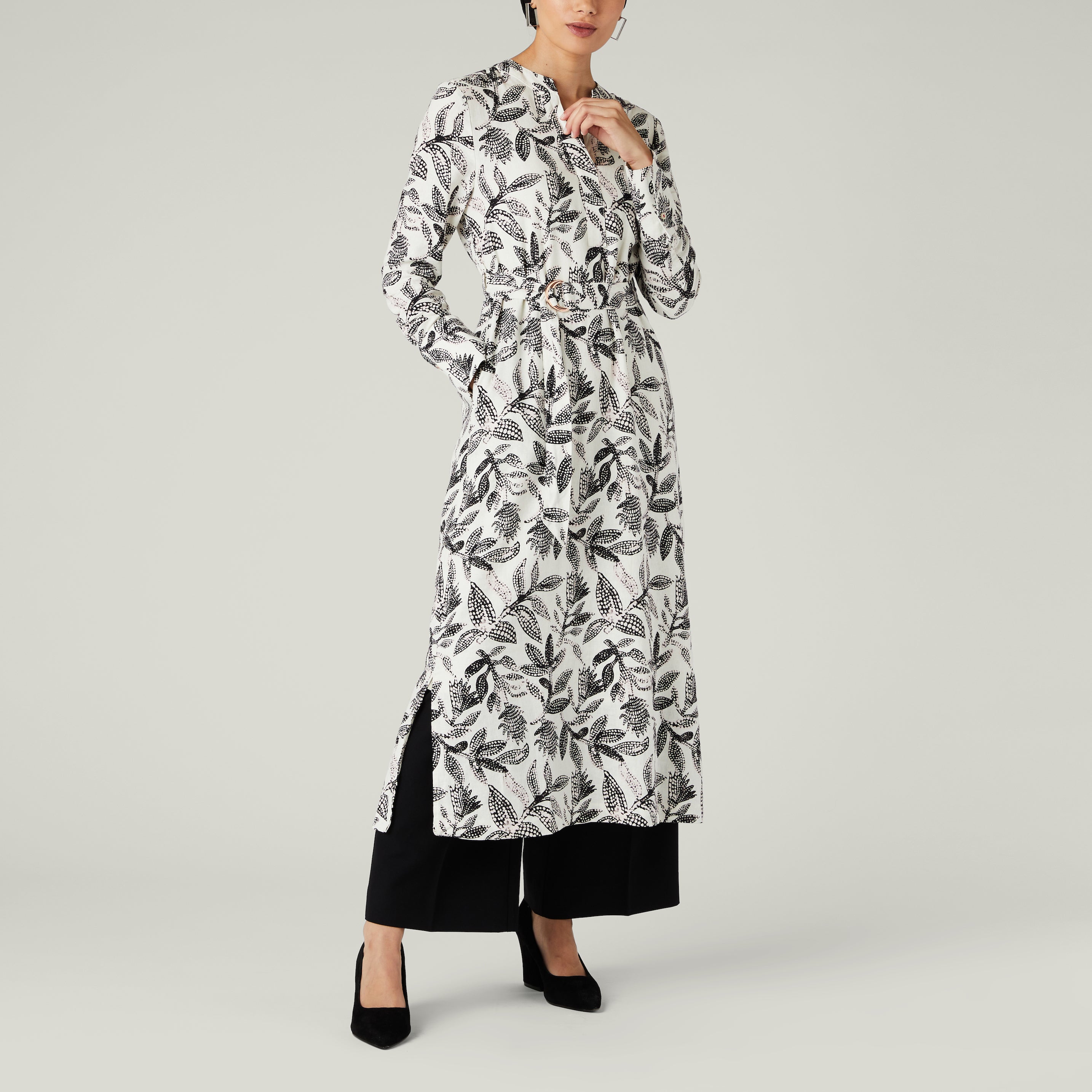 Long Kurta Style Tunic Dress with side splits, pockets and extra long d-ring belt for styling versatility. Belt shown wrapped twice. Long cuffs. Midi length. Linen Viscose Blend for year round use.