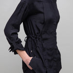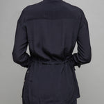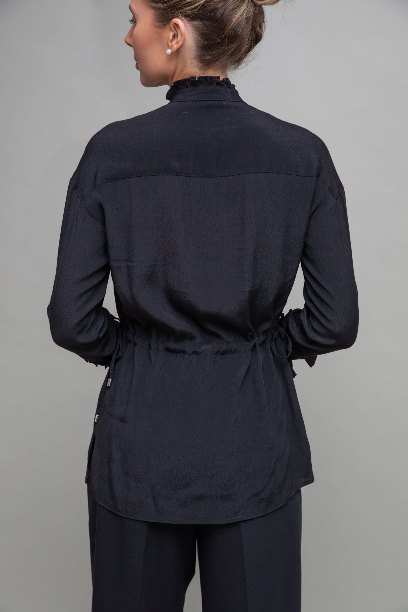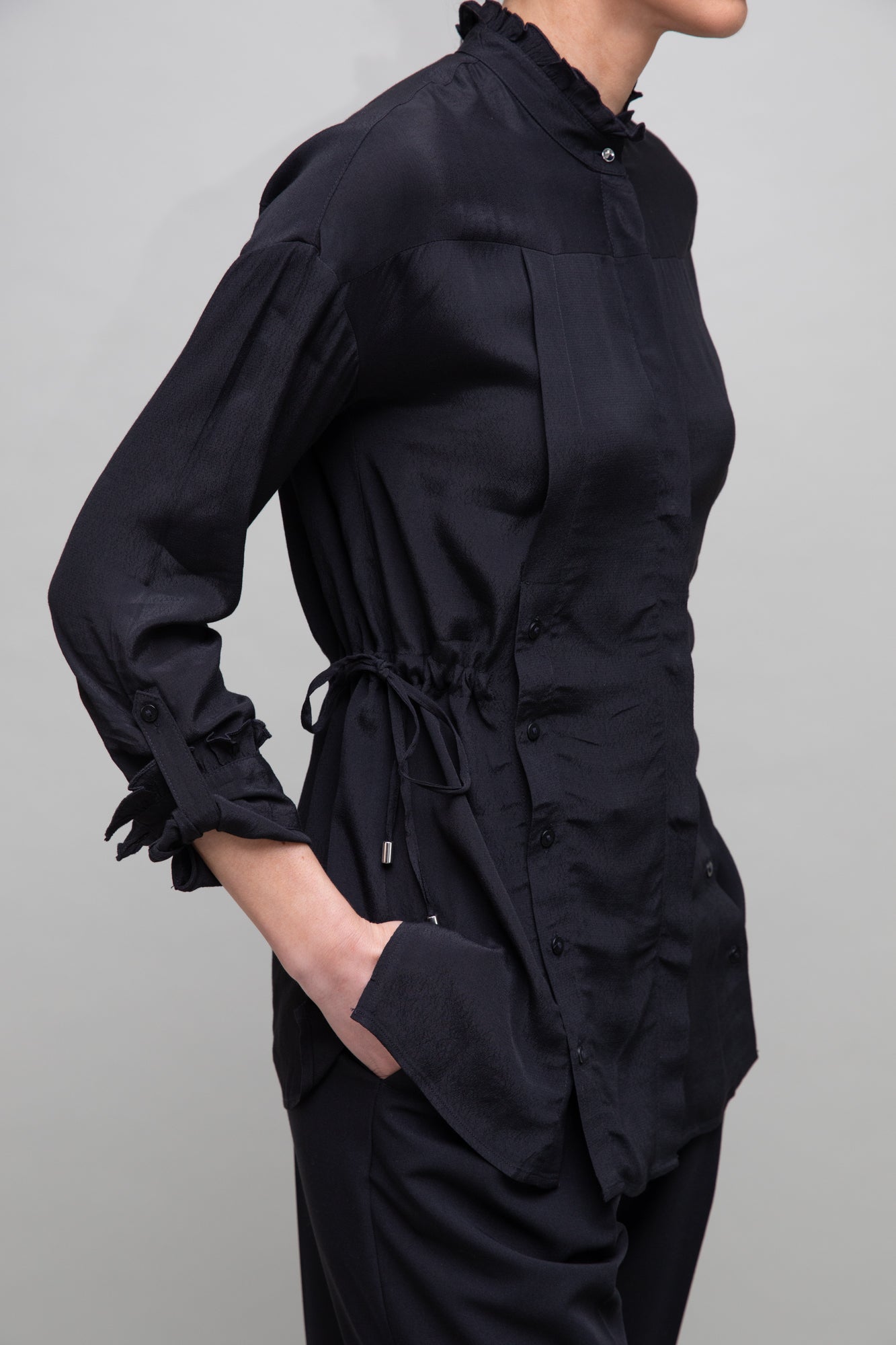 The ultimately adjustable blouse with a buttoned opening front section, drawstring at waist across the back, turn up sleeves with elegant frilled high collar. Designed for styling versatility and to reinvent your outfits again and again.