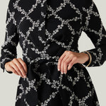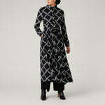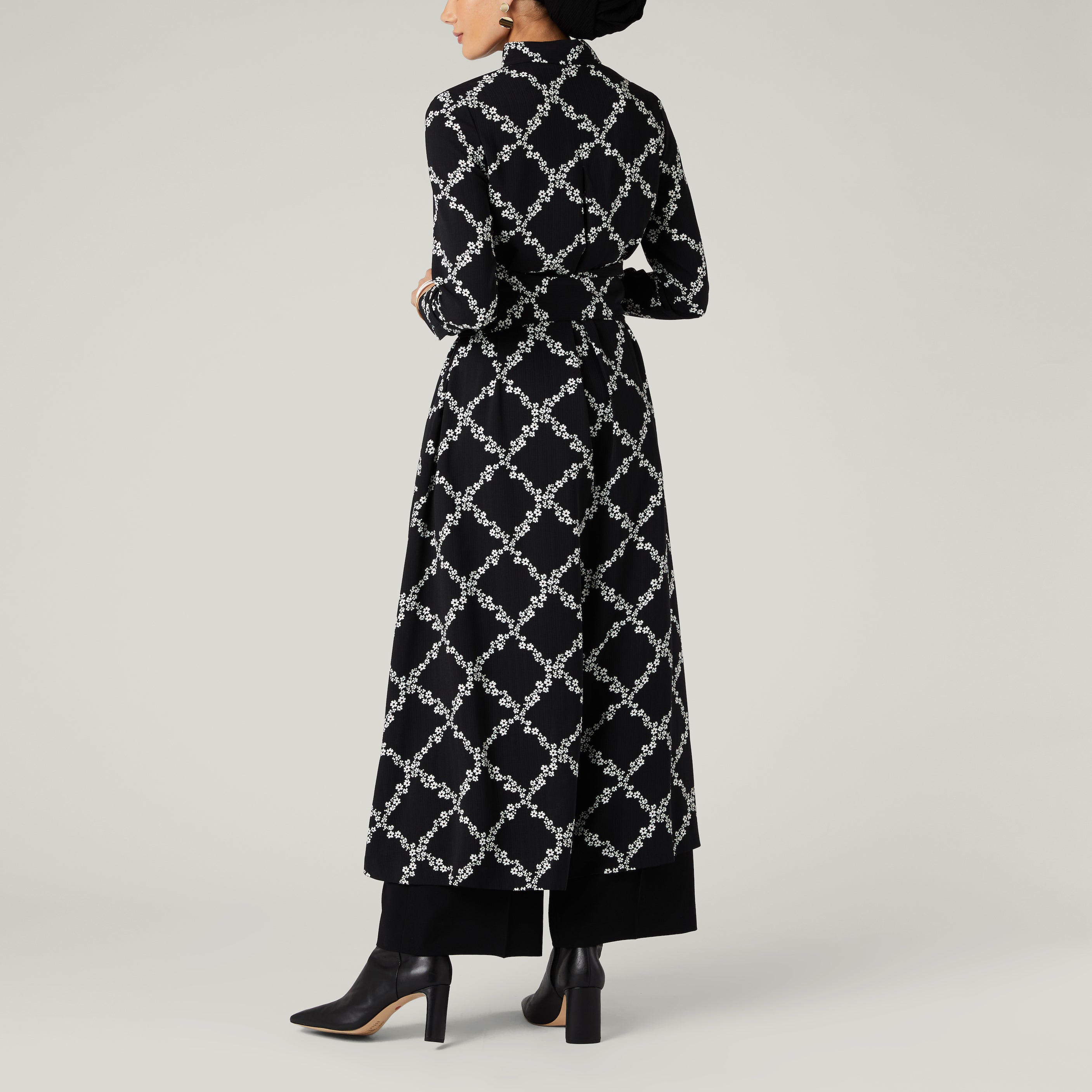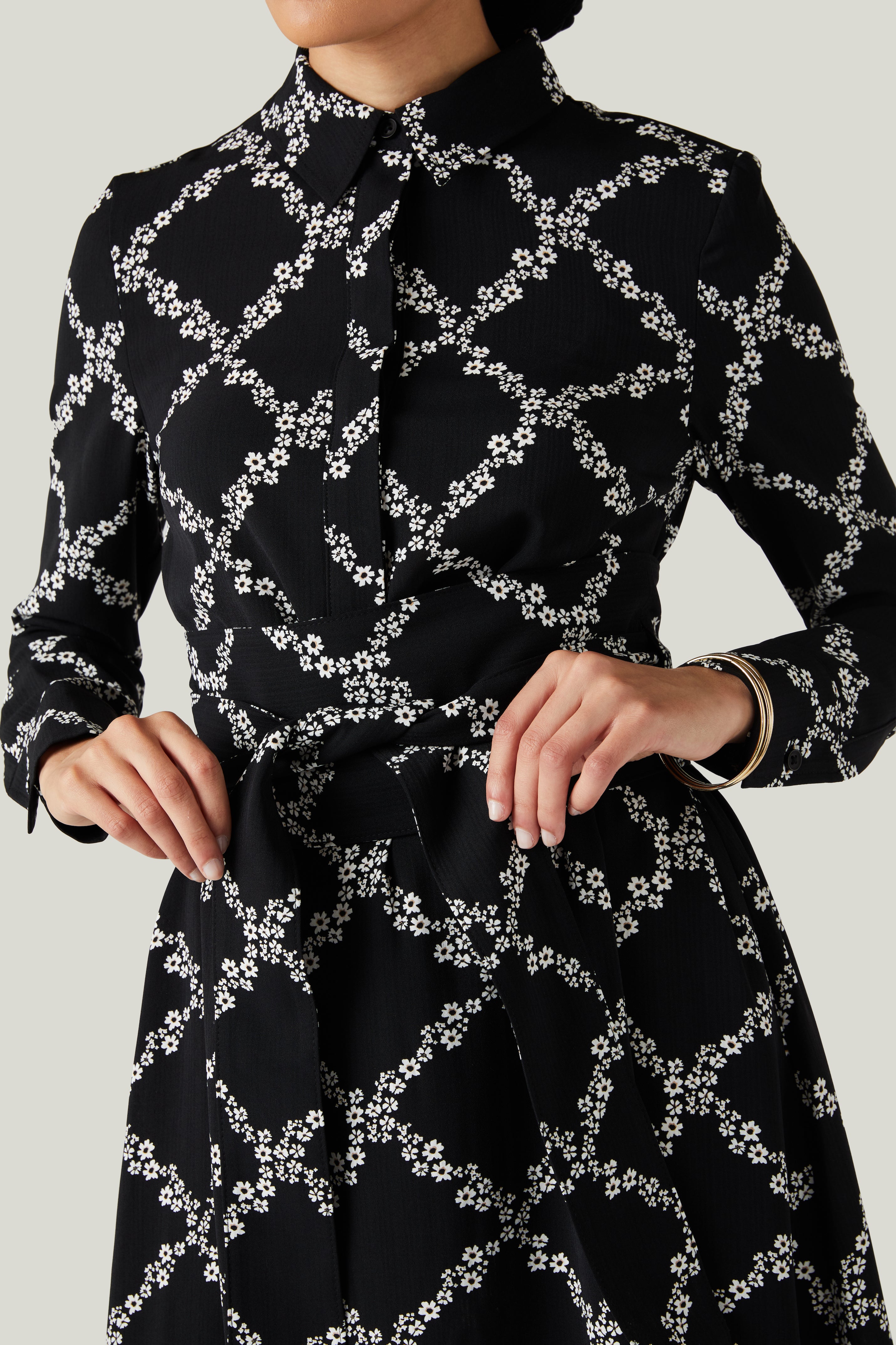Daisies in a criss-cross print. A line dress with opening front placket. With a Kimono inspired obi belt, extra wide at the centre to create a corseted fit with self tie narrower ends. Wear with belt or belt free. Cotton blend in a midaxi length. With Collar, cuffs and pockets. Regal styling for work and occasions.