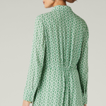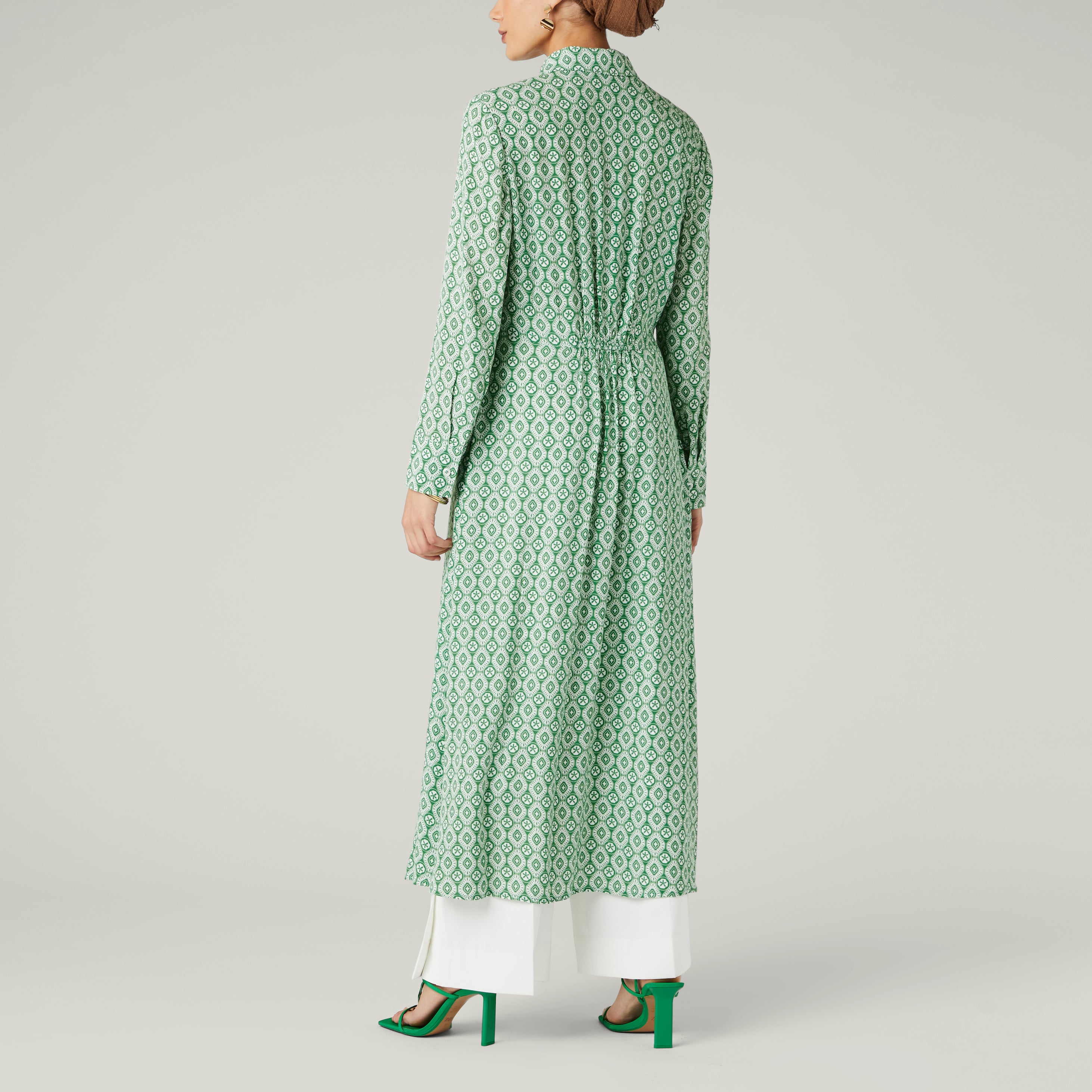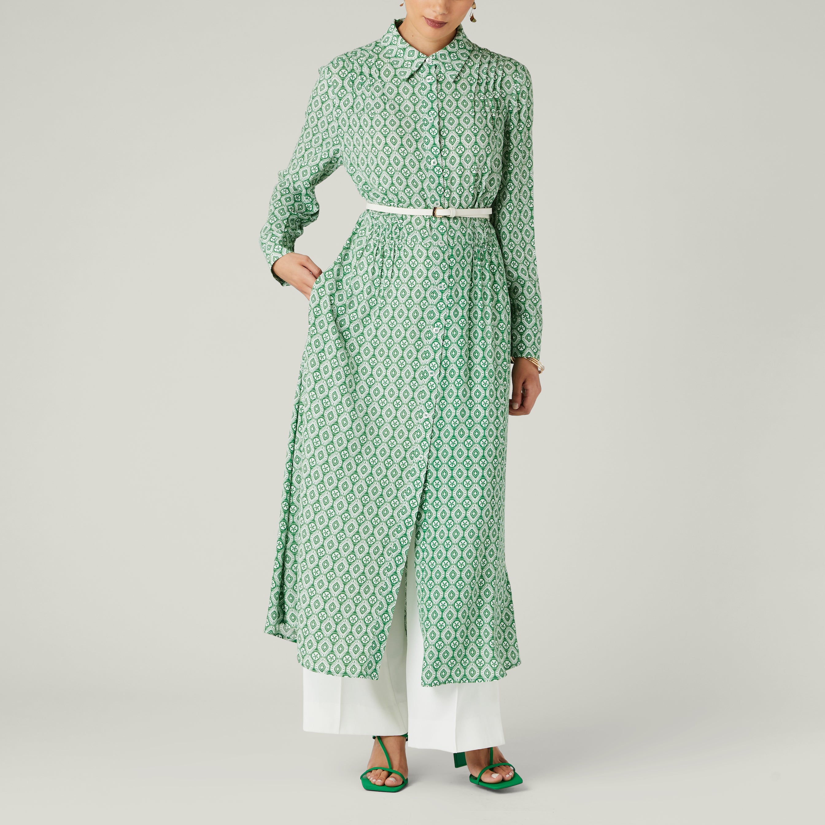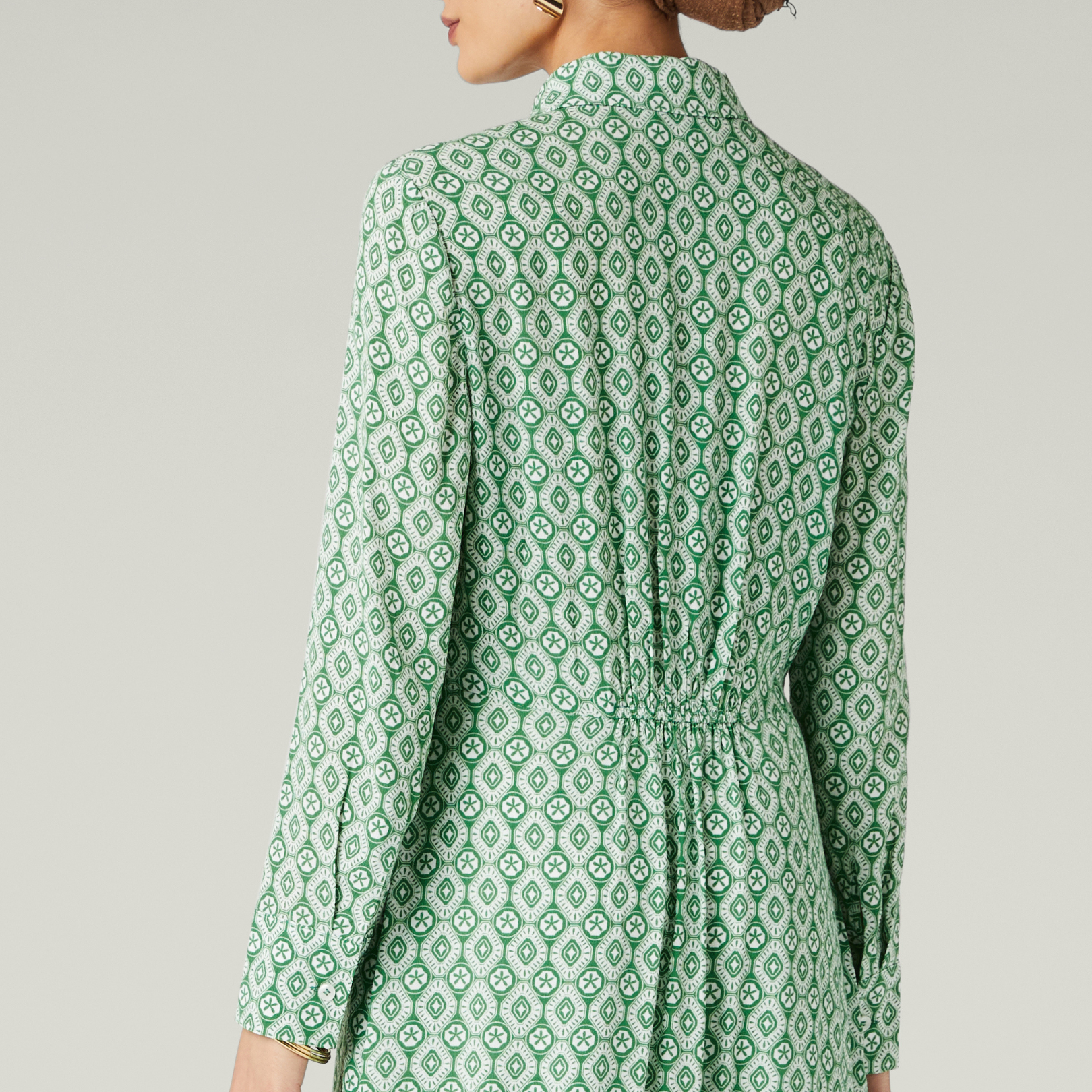 A gorgeously classic shirt dress. Crepe viscose in a full button down midaxi length. Light shirring at back and in front panels for a gently fitted silhouette. Collar, cuffs and Micro pleating at shoulders with ever essential pockets. Cross seasonal wear for injecting colour in vibrant green.