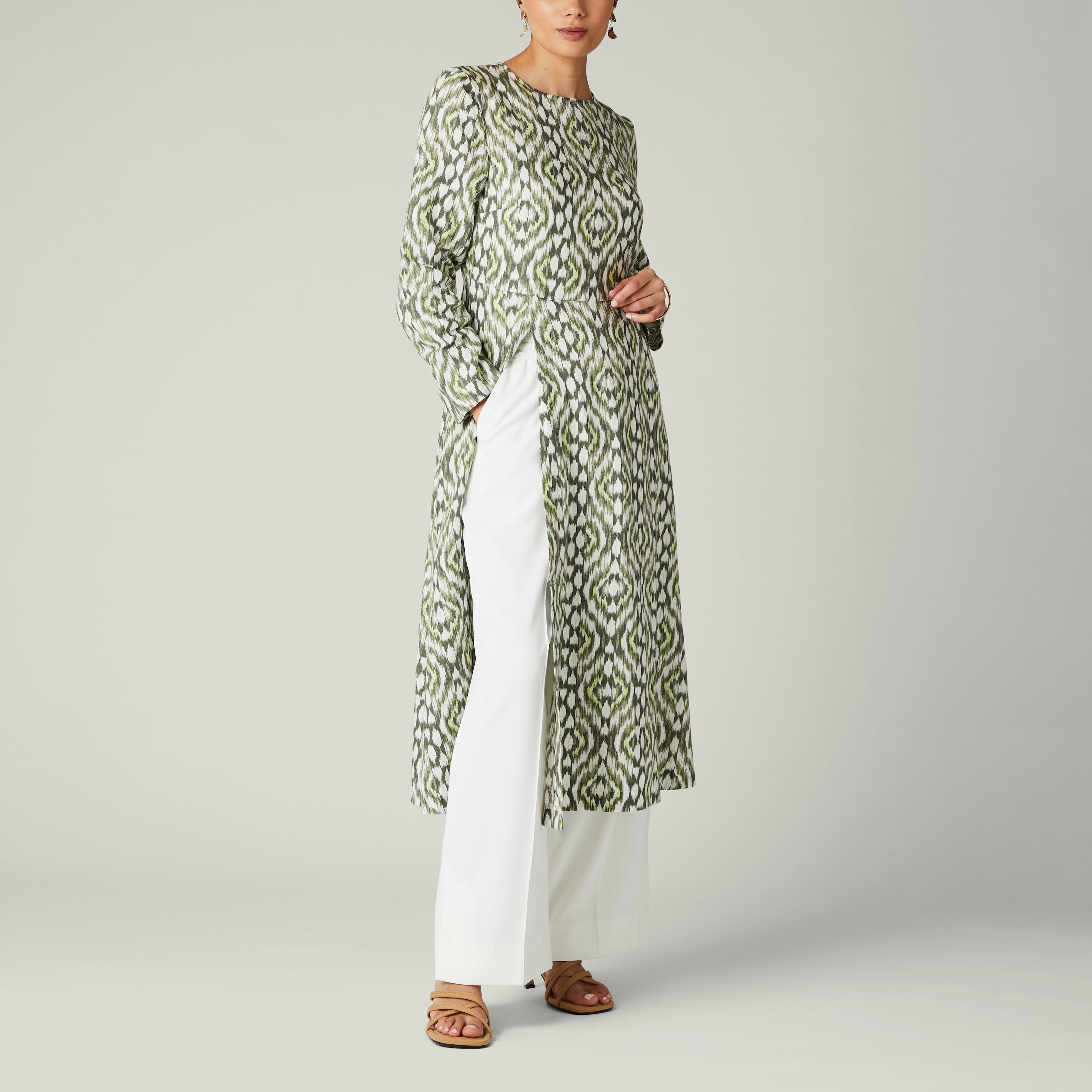 Long top style dress with single split from waist, designed to be worn with trousers. 100% Linen