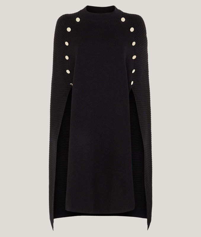 Unveil your mystique in the Enigmatic Voyager Cape – our bestselling mid-length masterpiece. Weaved with ribbed panels, this cape is like a poetic verse penned with threads. The brass button detail is akin to a treasure chest's lock, holding stories untold. It offers an embrace with its easy fit, or you can choose to belt it for an extra dash of intrigue and shape. Don this cloak of untold stories and become the voyager of your own legend.