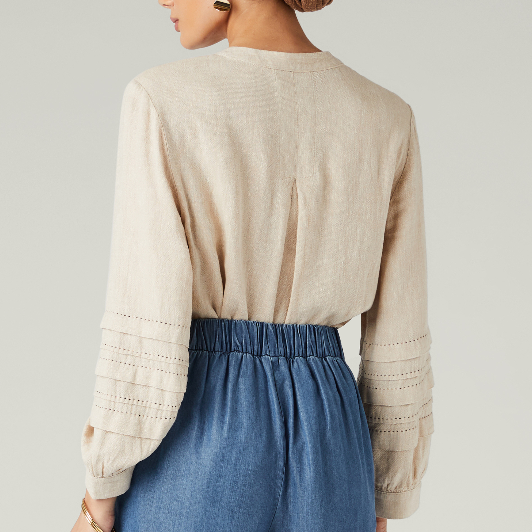 Soft sand linen viscose blend shirt blouse cotton with beautiful contrast stitch detailing on sleeves. A subtle statement shirt with no other layers needed. Covered front placket with full length button opening. Inverted pleat at back.