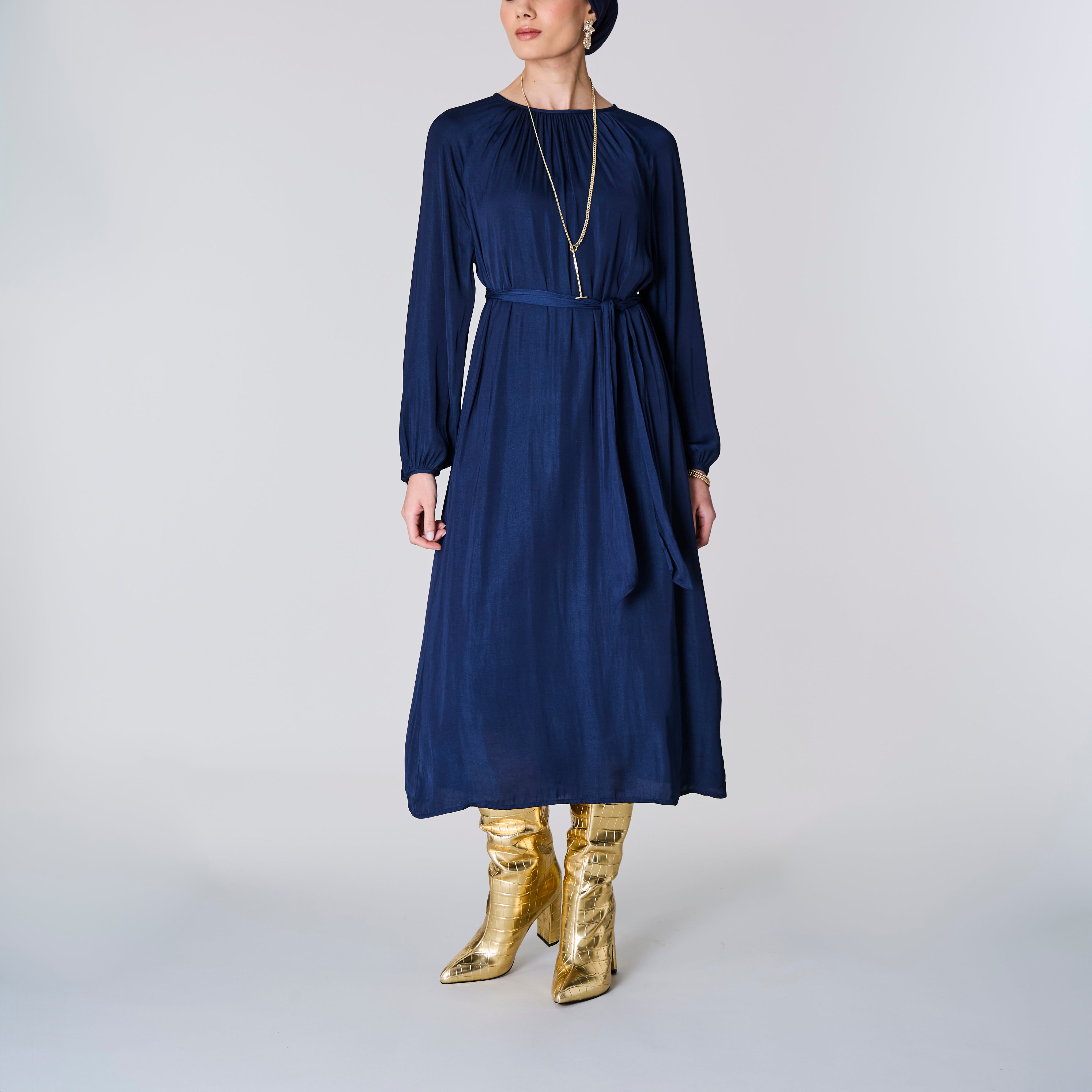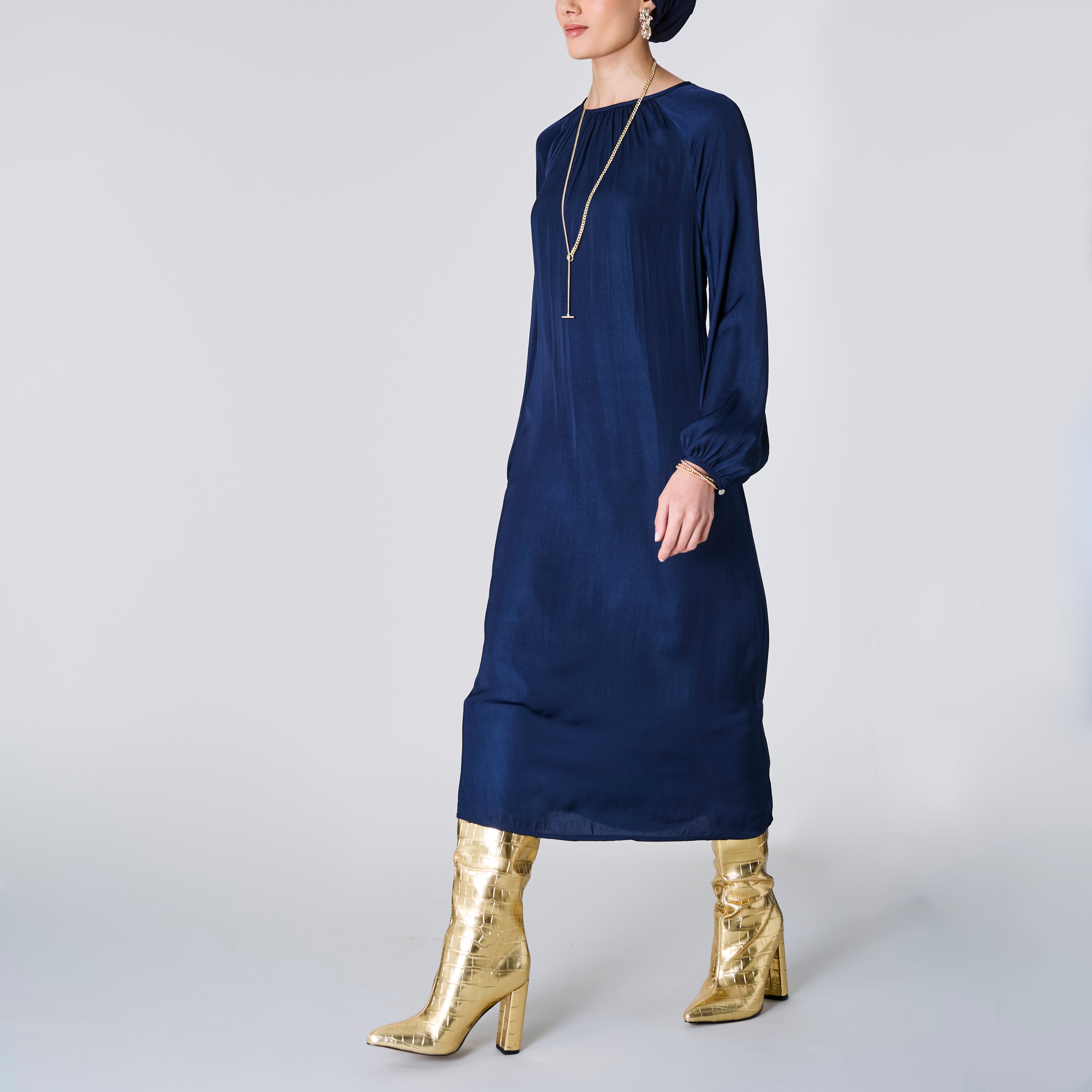 Long Sleeve Satin Dress, Navy