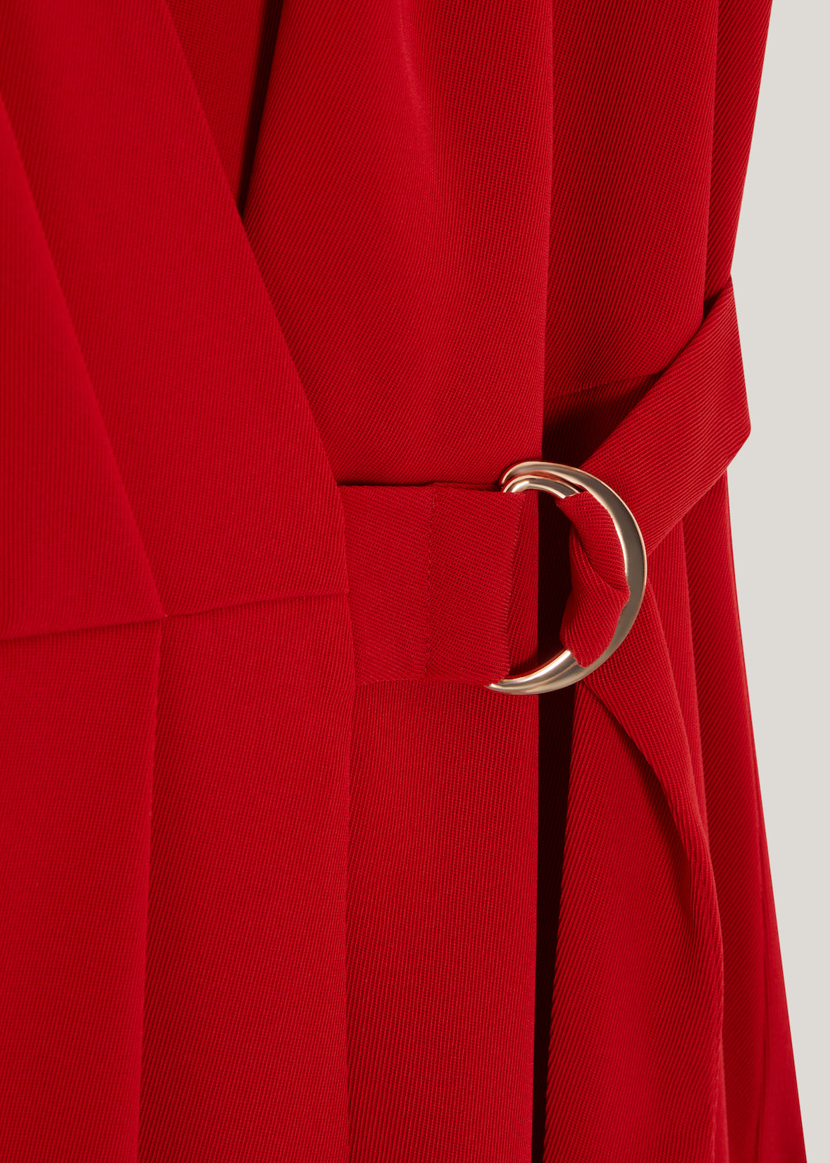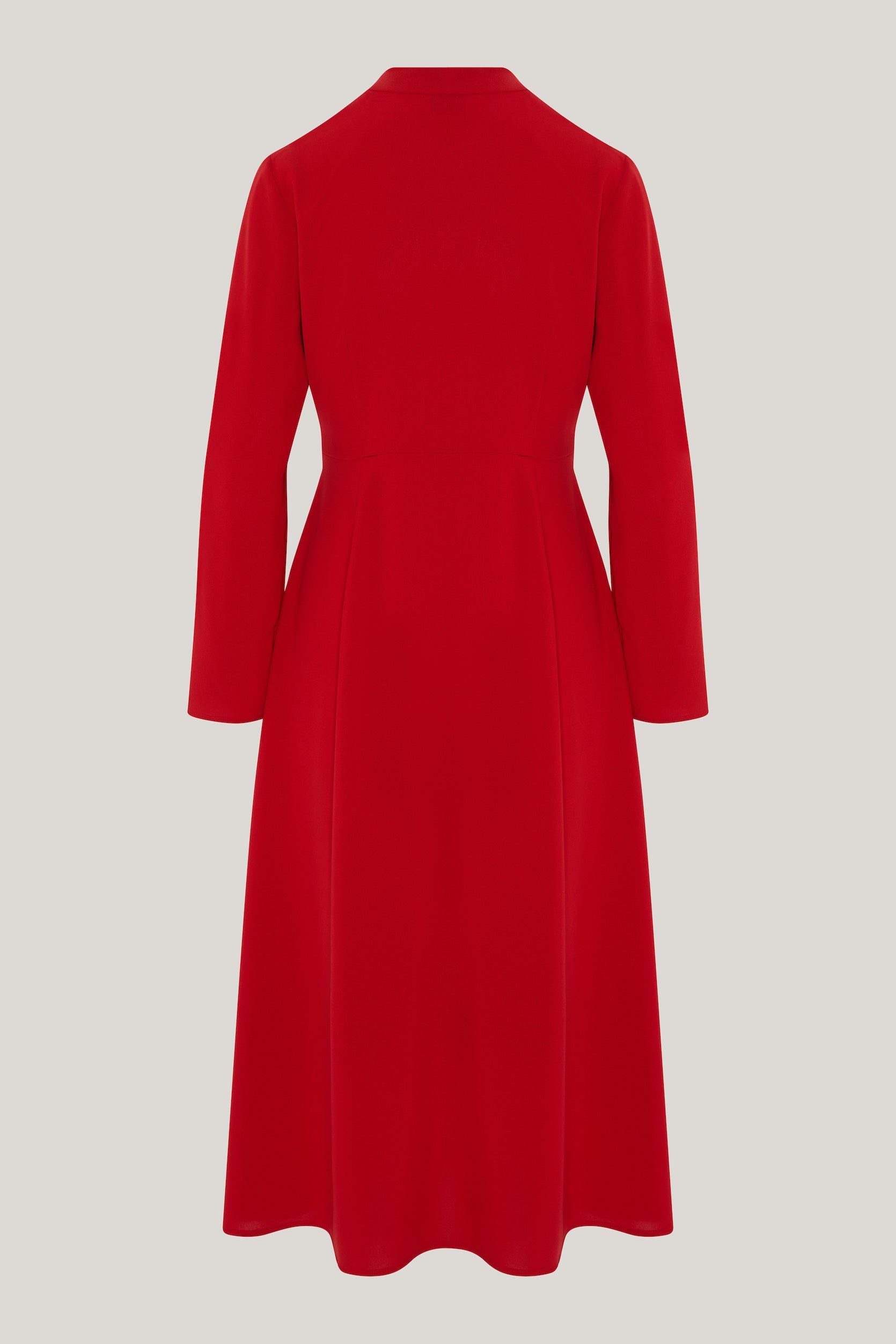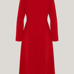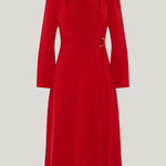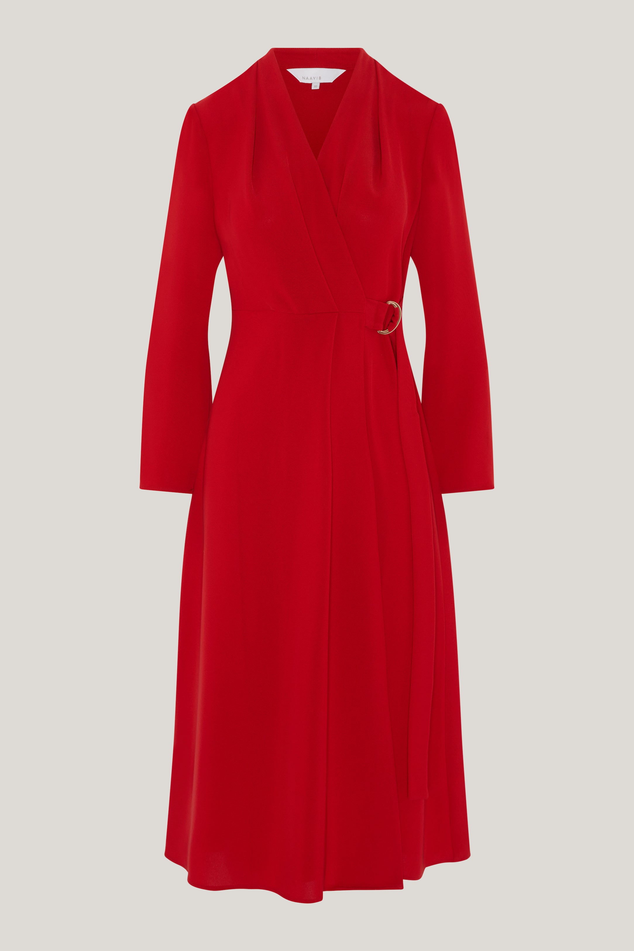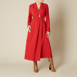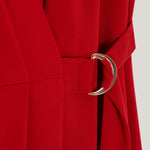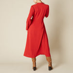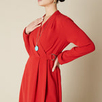 The Radiant Athira Dress - the epitome of glamour infused with a whisper of demure. Bathed in a rich shade of red, this dress wraps around you like a fierce embrace from a flaming sunset. The modest neckline, crafted with exquisite curved tailoring. Delicate pleat detailing at the shoulders adds depth, while the full wrap at the waist paints the contours of your confidence.