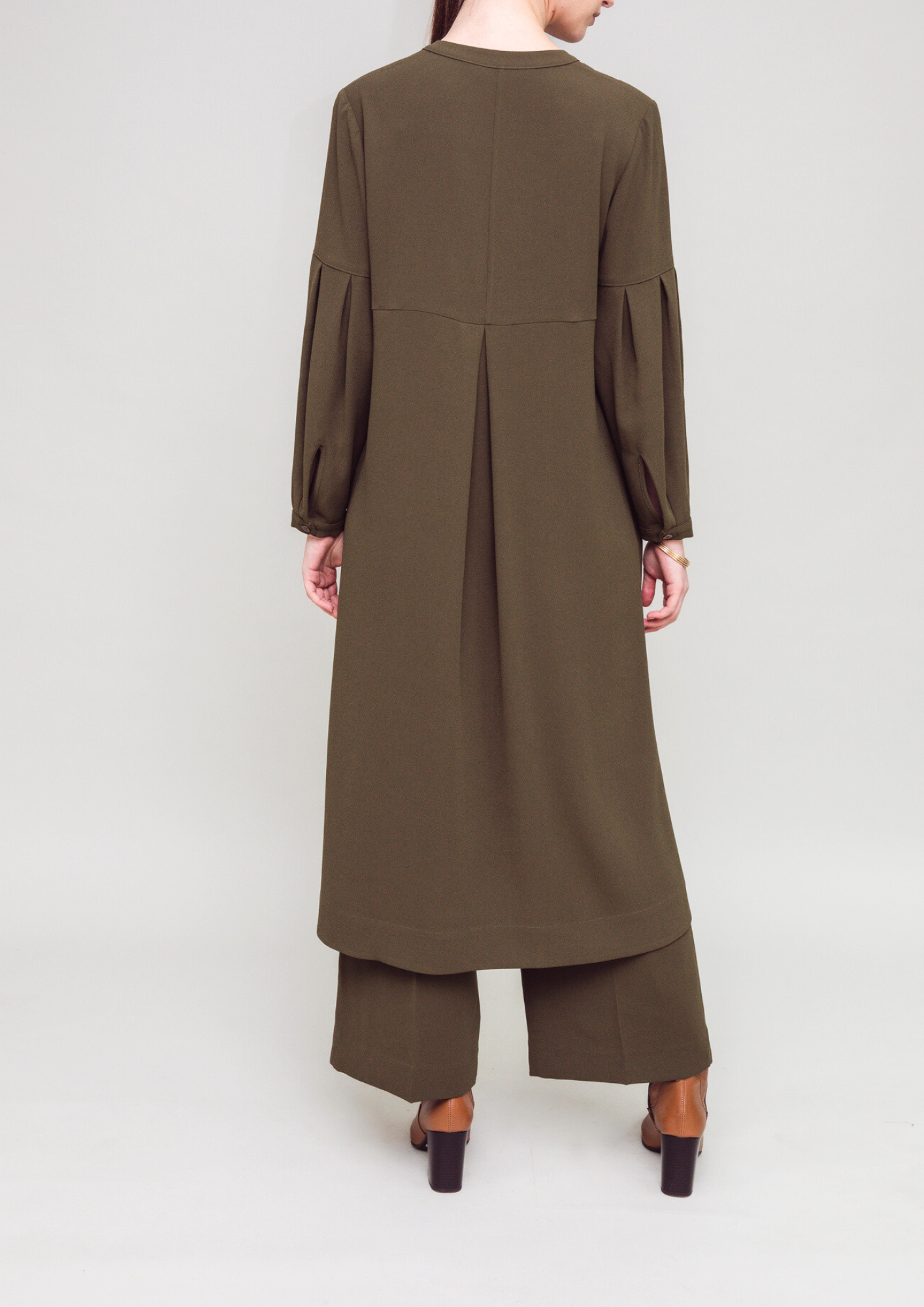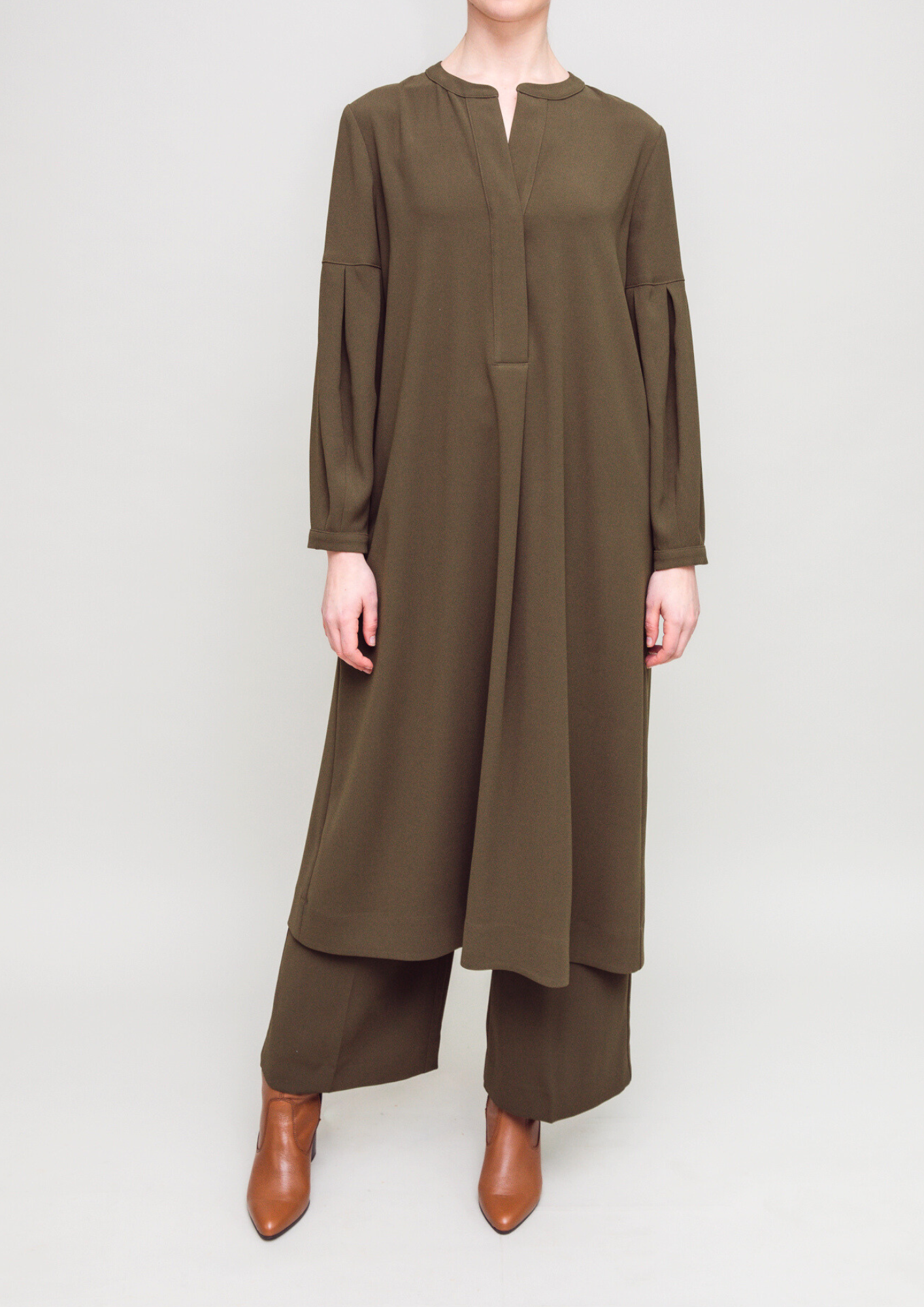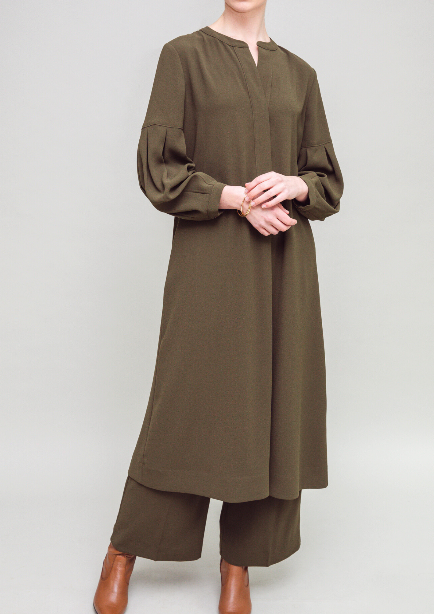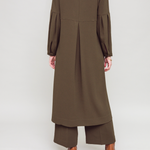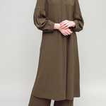 Relaxed loose fit midi tunic dress. Subtle tailoring at the neckline and pleated balloon sleeves channel a hint of romance. Semi-fitted with a dropped yoke and an inverted pleat at mid back, this dress cascades into a floaty silhouette that captures the very essence of a gentle zephyr. An eminently stand-alone or style-able piece.
