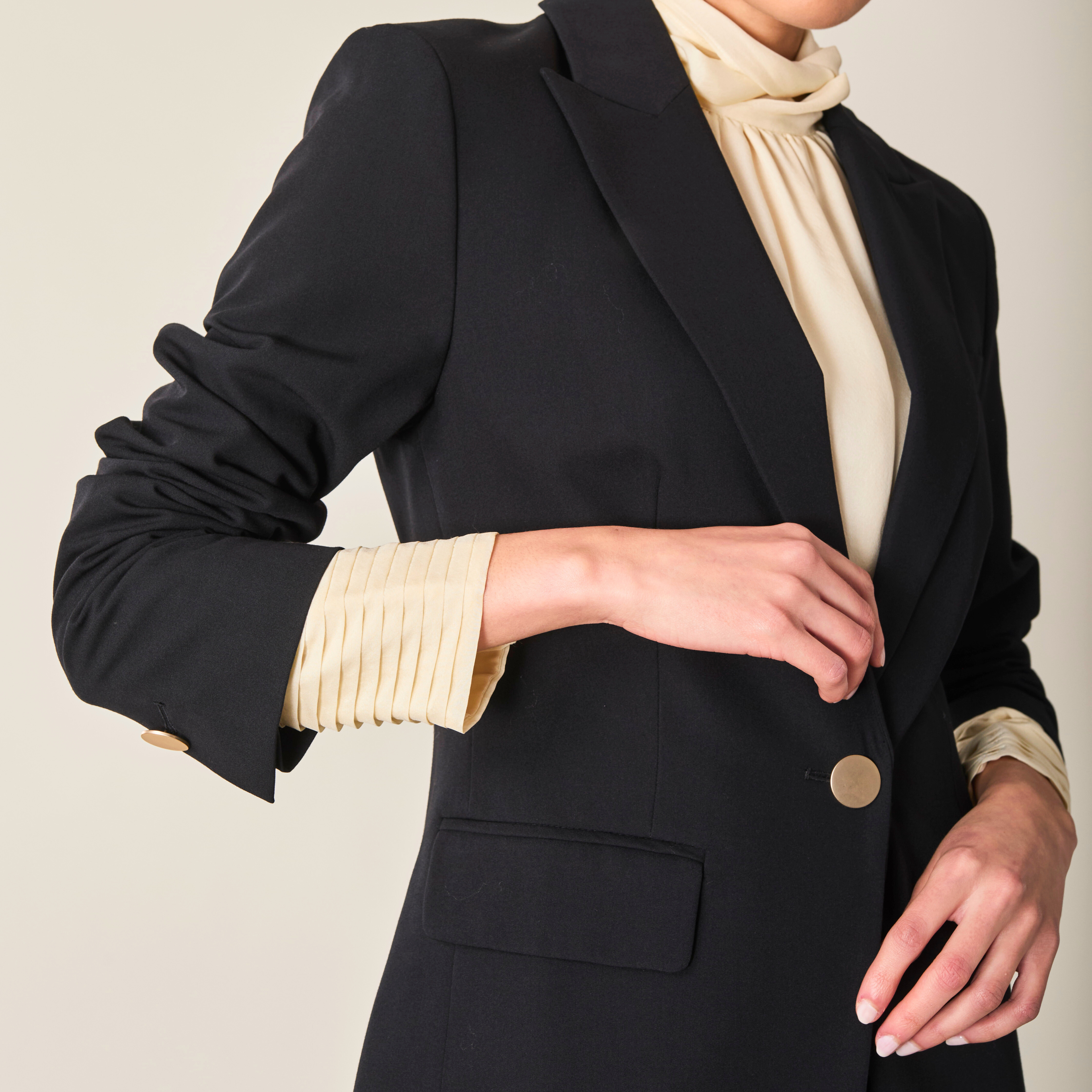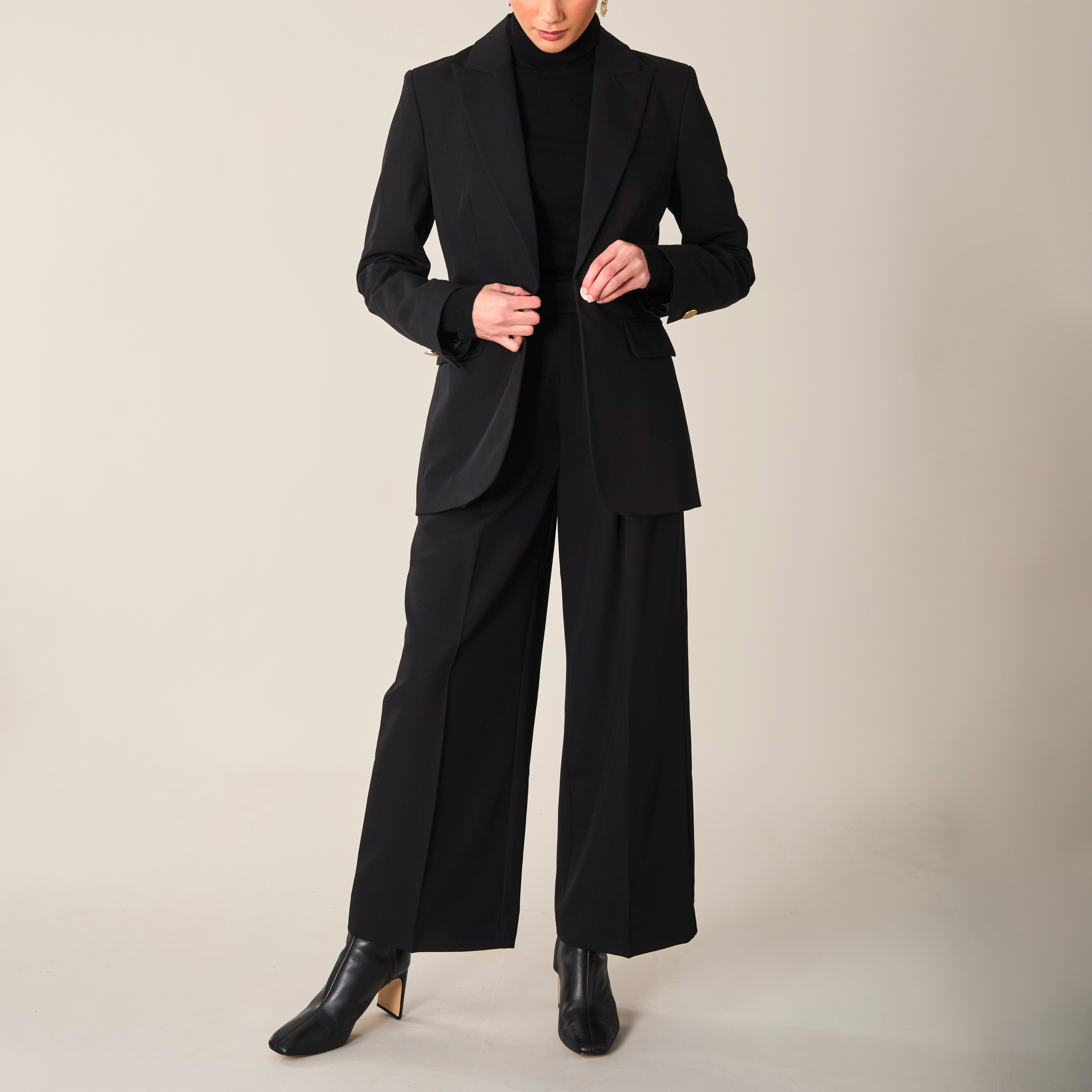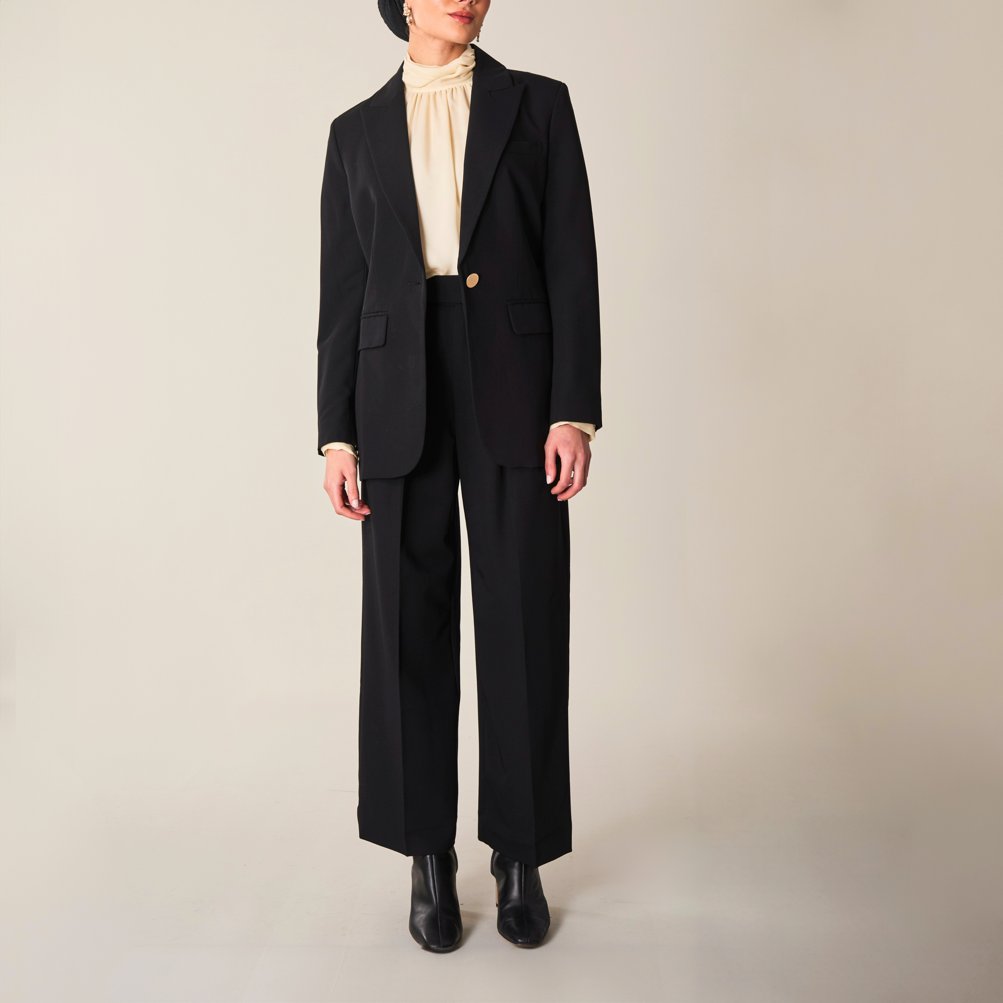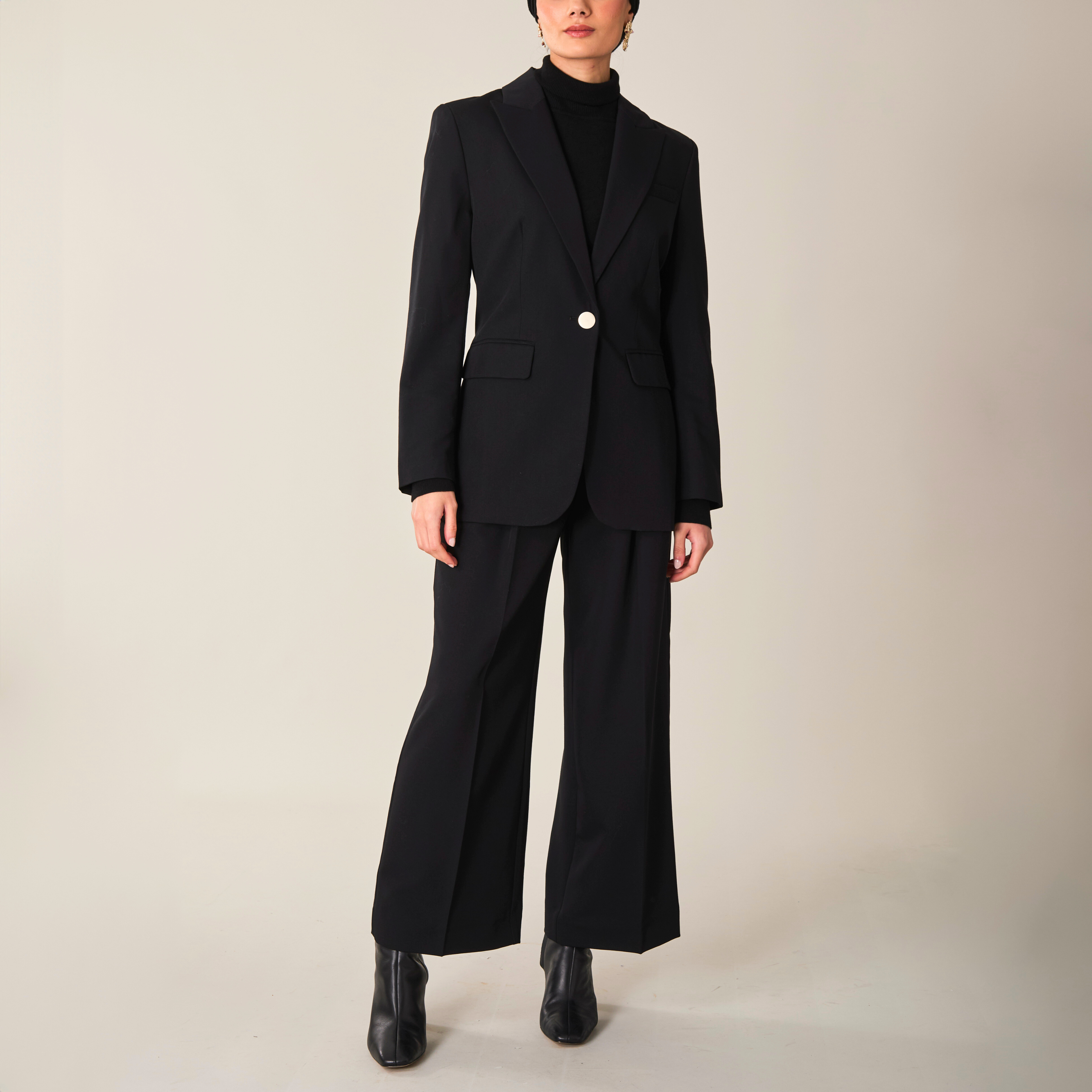 This single-breasted design features a relaxed cut for a fit that's both flattering and comfortable. Practicality meets elegance with welt pockets and a smooth lining for added comfort. Securely fastened with a single button, this blazer effortlessly combines classic style with modern ease, making it a versatile addition to your wardrobe. Matching trousers available
