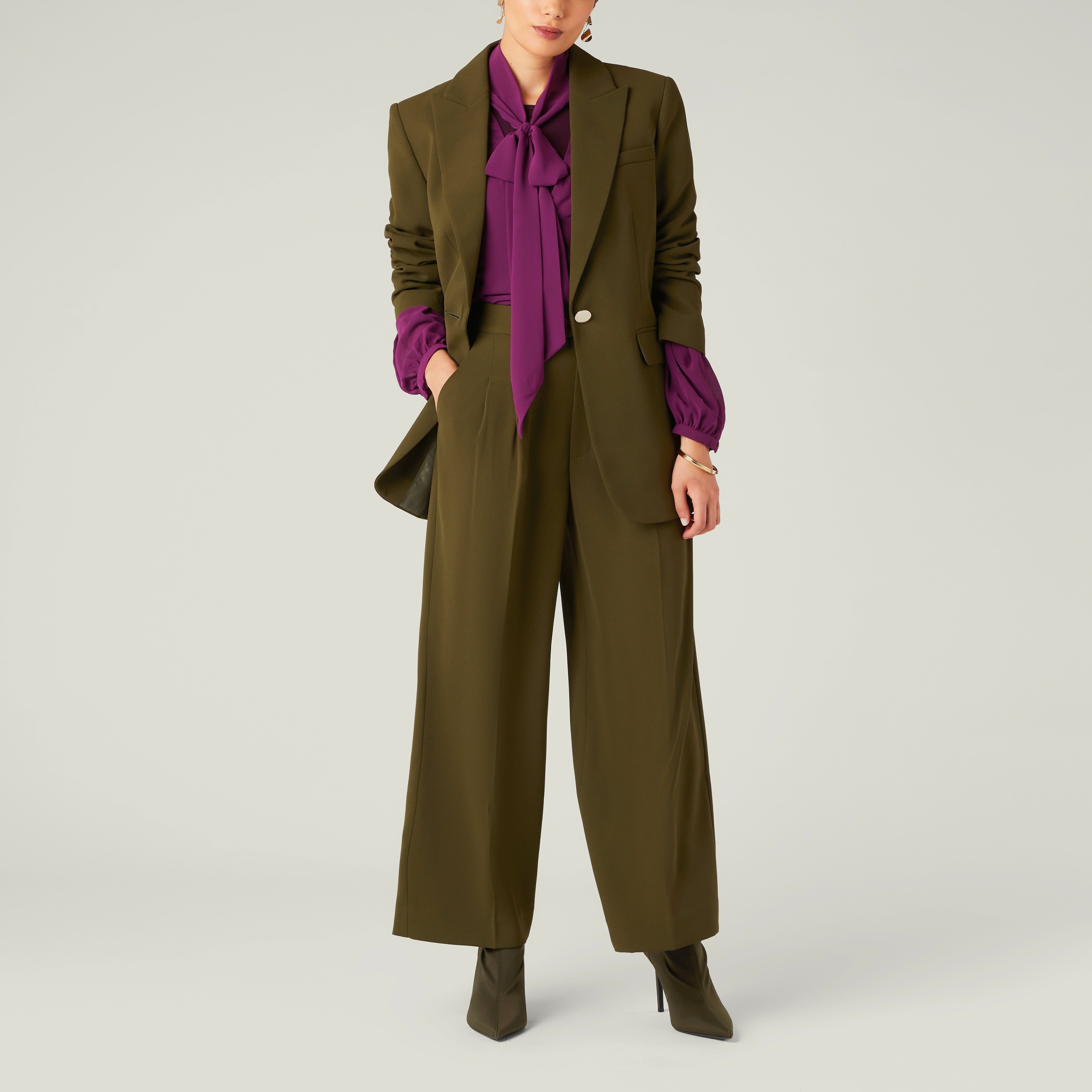 This single-breasted design features a relaxed cut for a fit that's both flattering and comfortable. Practicality meets elegance with welt pockets and a smooth lining for added comfort. Securely fastened with a single button, this blazer effortlessly combines classic style with modern ease, making it a versatile addition to your wardrobe. Matching trousers available
