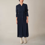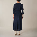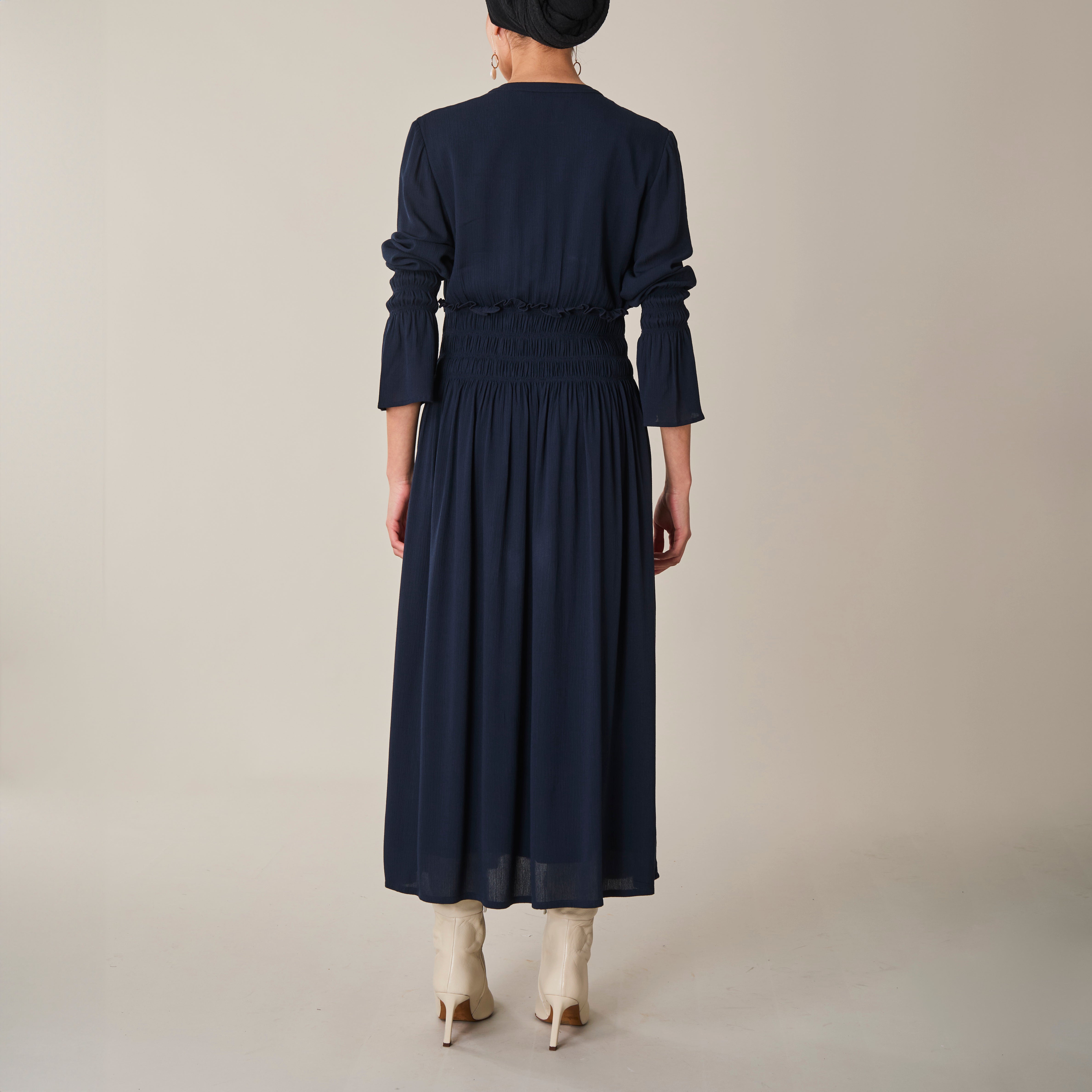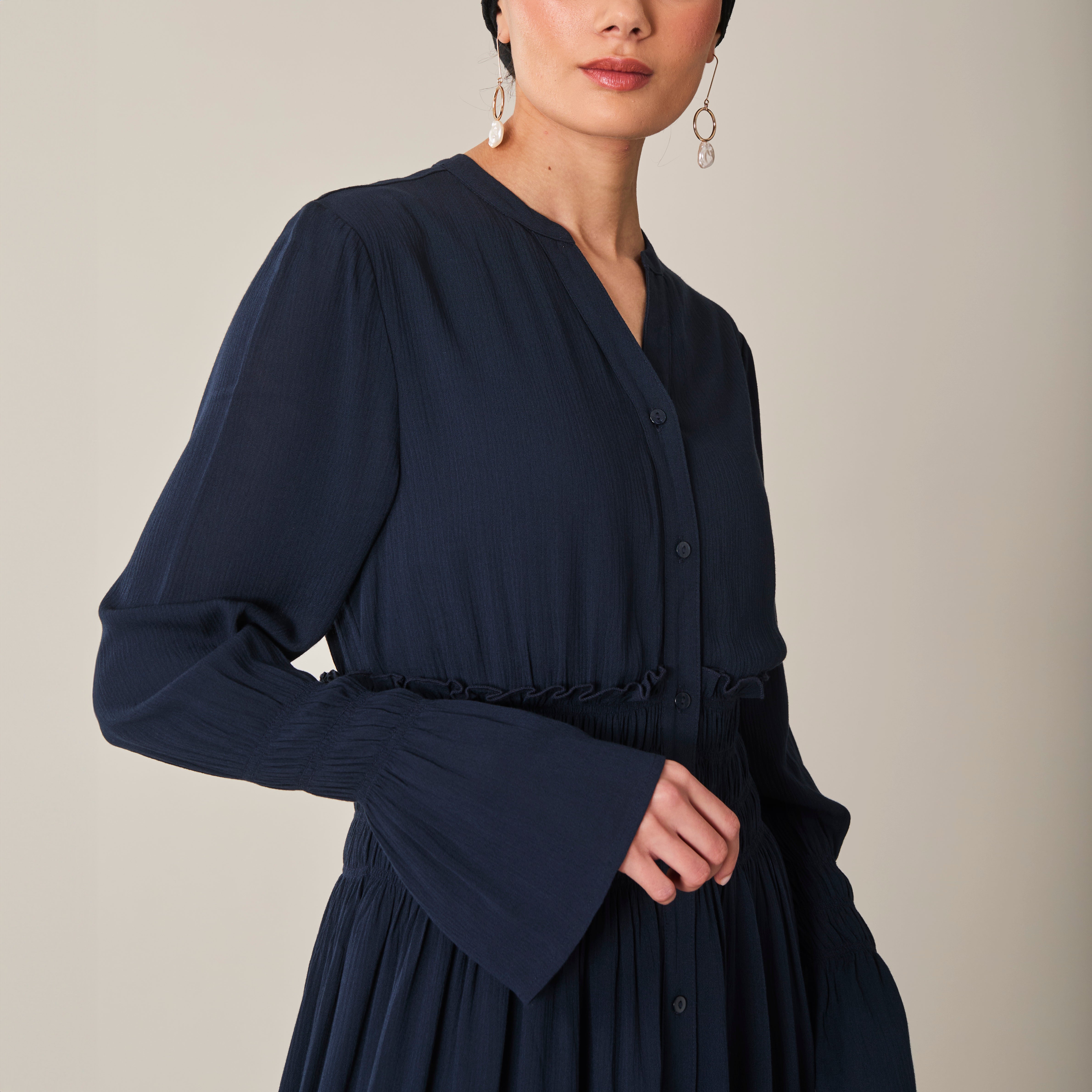 Maximal shirring at waist and sleeves create an easy to wear style in a softly crinkled sheer fabric, fully lined body, sleeves unlined.