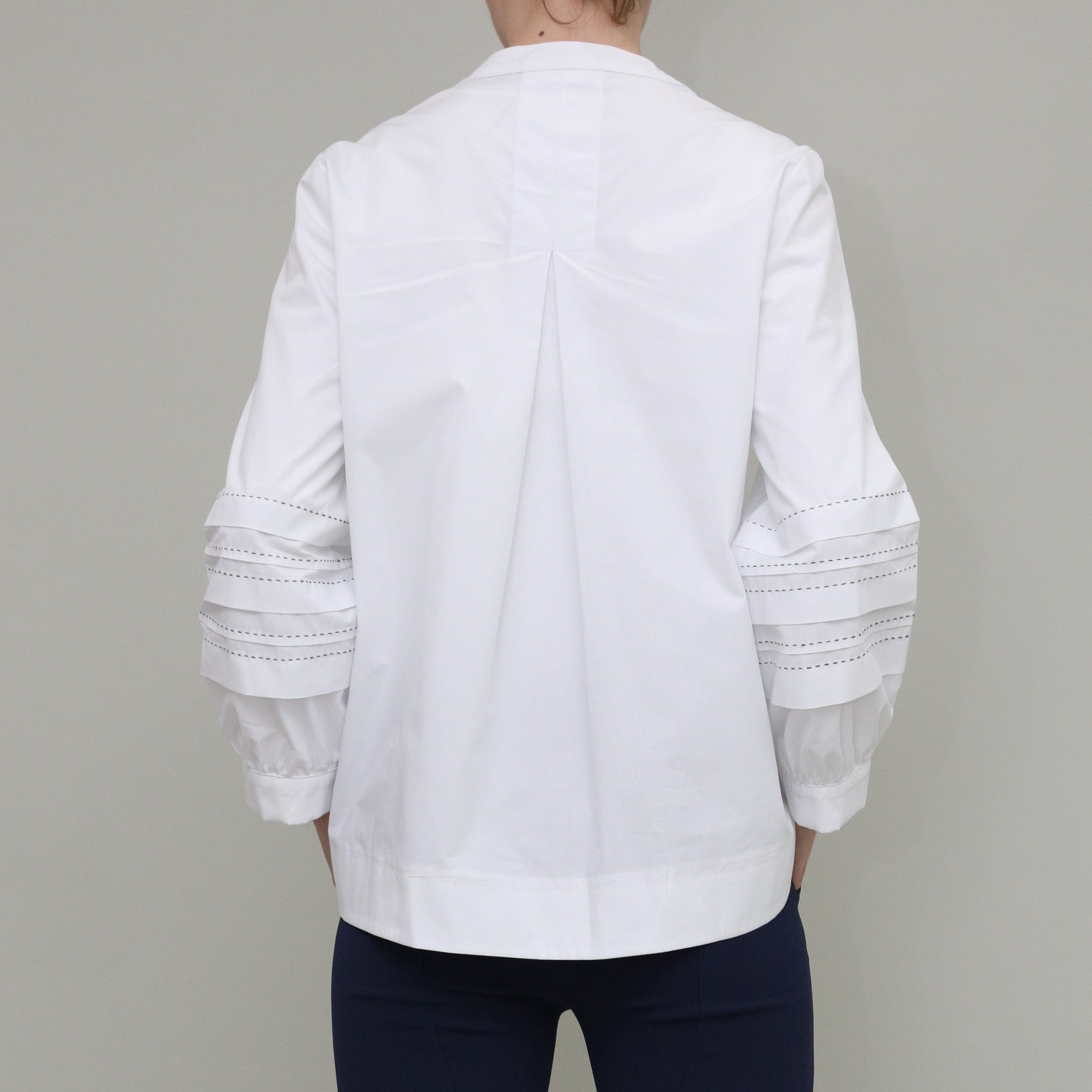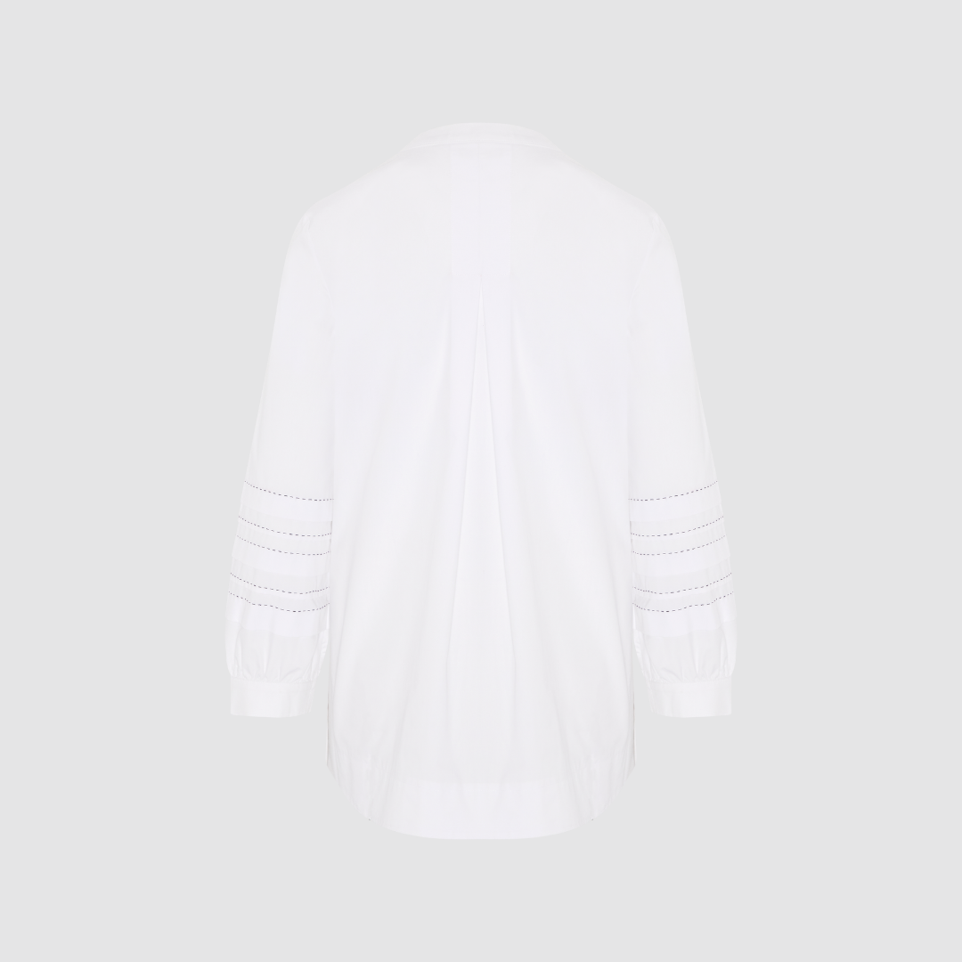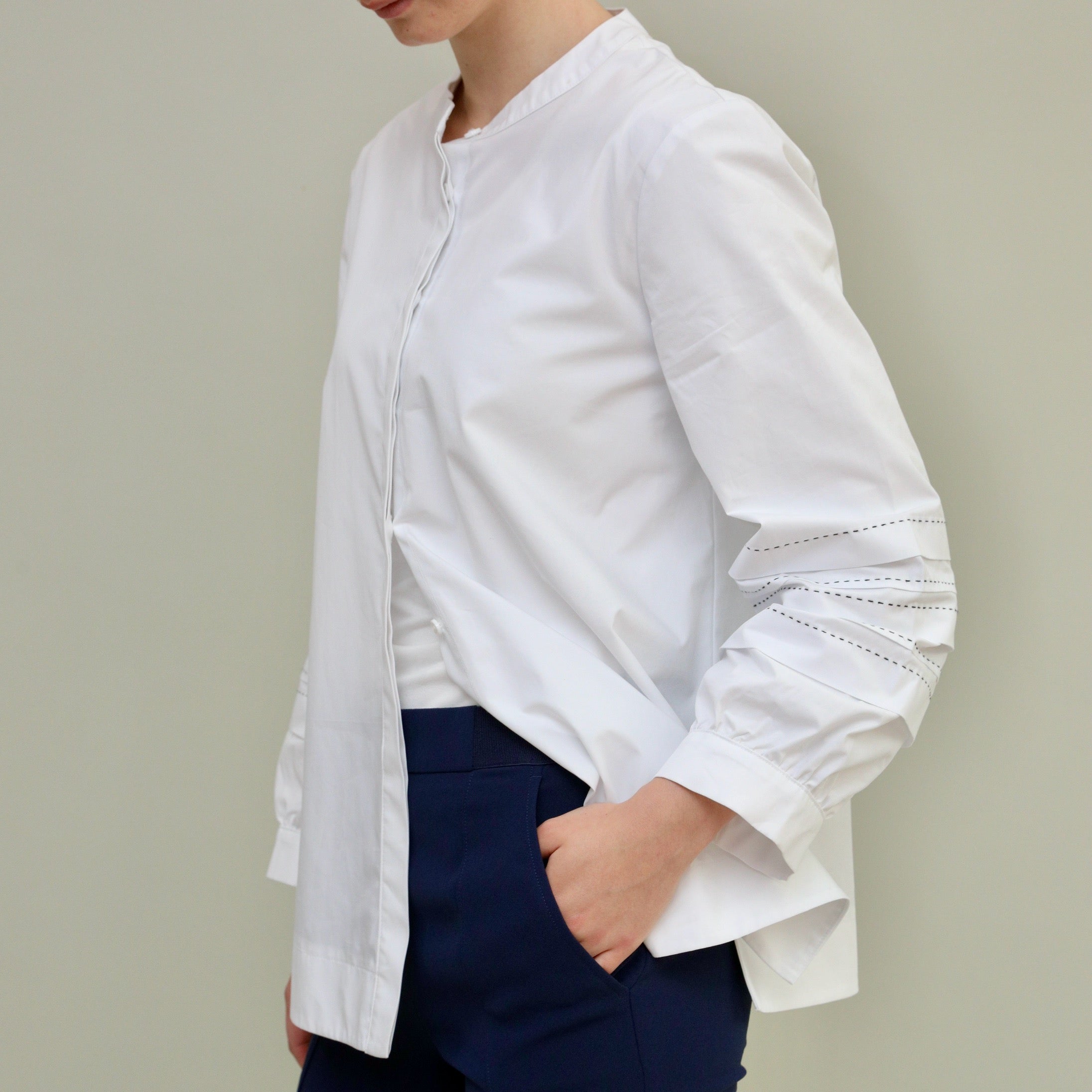 Crisp white cotton with beautiful contrast stitch detailing on sleeves. A subtle statement shirt with no other layers needed. Covered front placket with full length button opening. Inverted pleat at back.