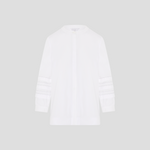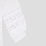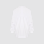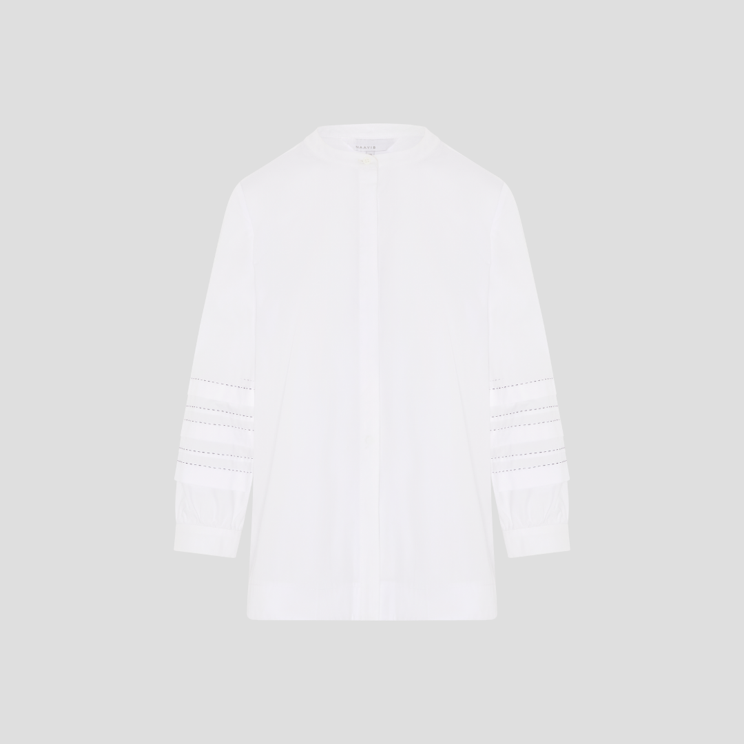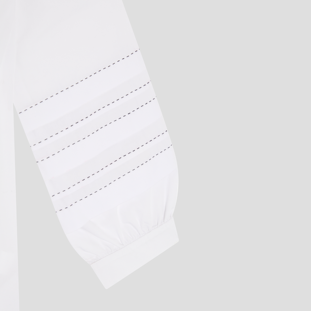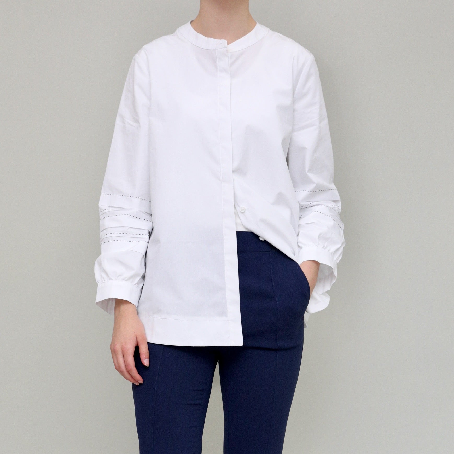 Crisp white cotton with beautiful contrast stitch detailing on sleeves. A subtle statement shirt with no other layers needed. Covered front placket with full length button opening. Inverted pleat at back.