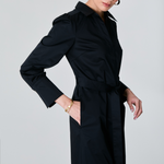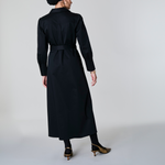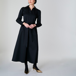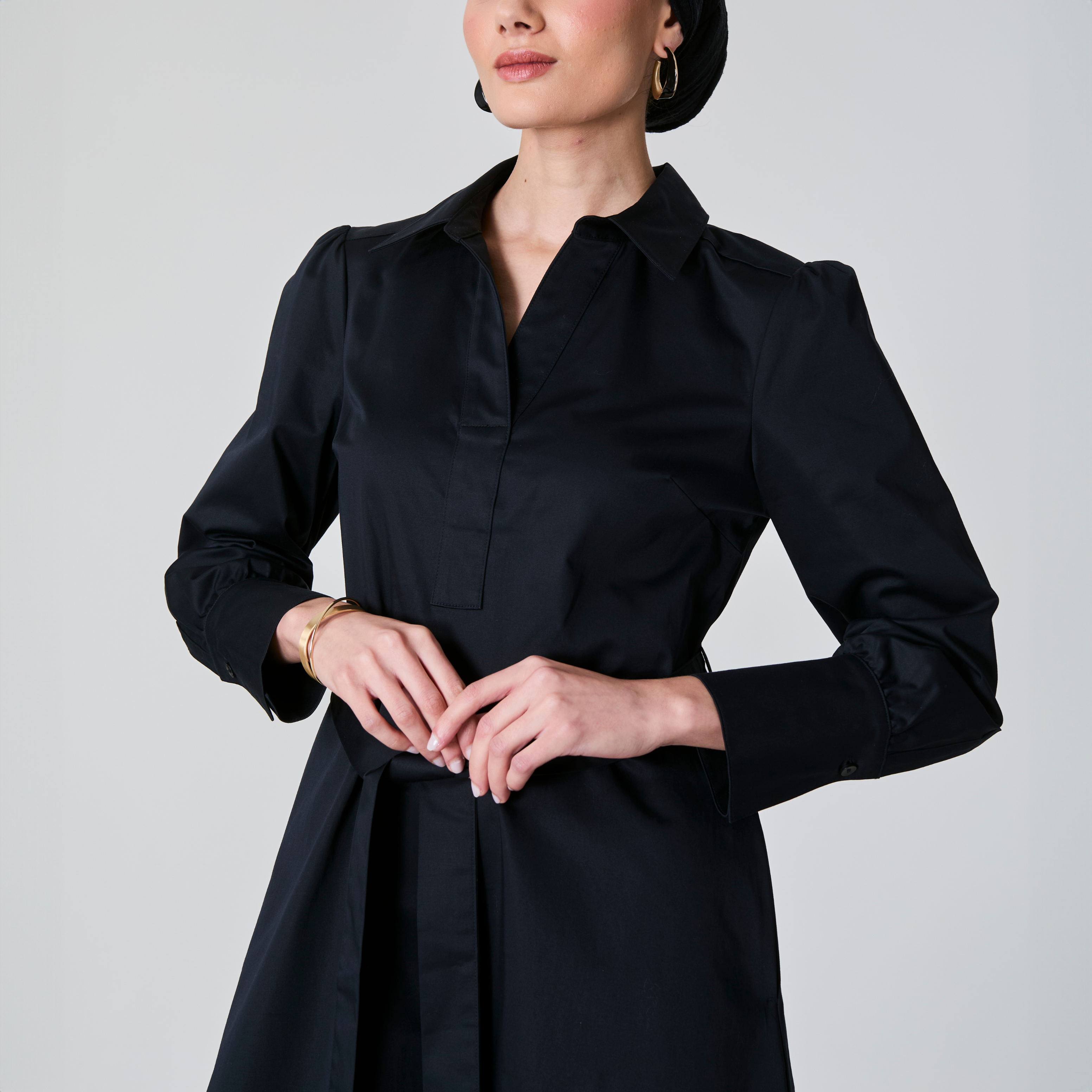Minimally collared and with an open placket, this dress has lightly puffed sleeves that creates an aura of subtle femininity. Long buttoned cuffs and a fitted cut and detachable belt.