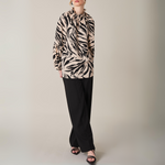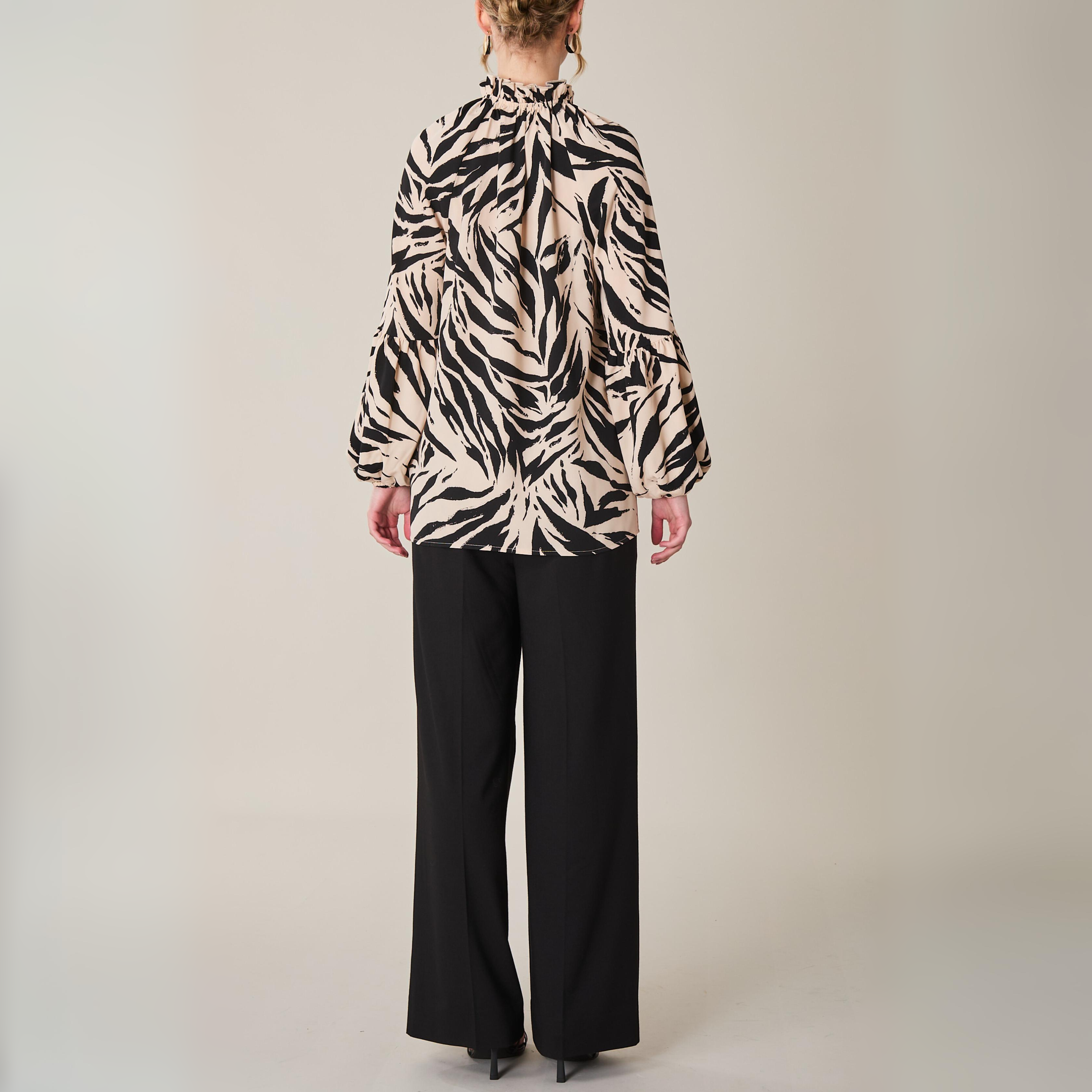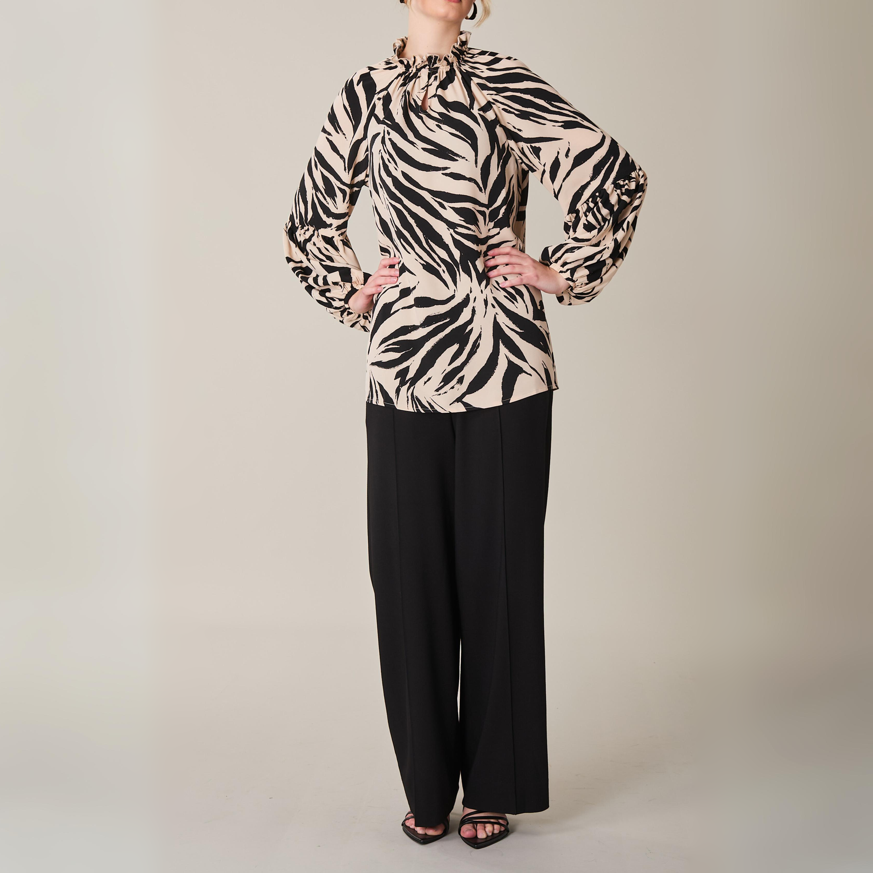 Long sleeved ruffled neck and billowy sleeves. A luxuriant zebra print in off-white and black. Destined to be a favourite animal print staple in sleek broad brush strokes, monochrome colour palette and easy to wear in a crease resistant material.